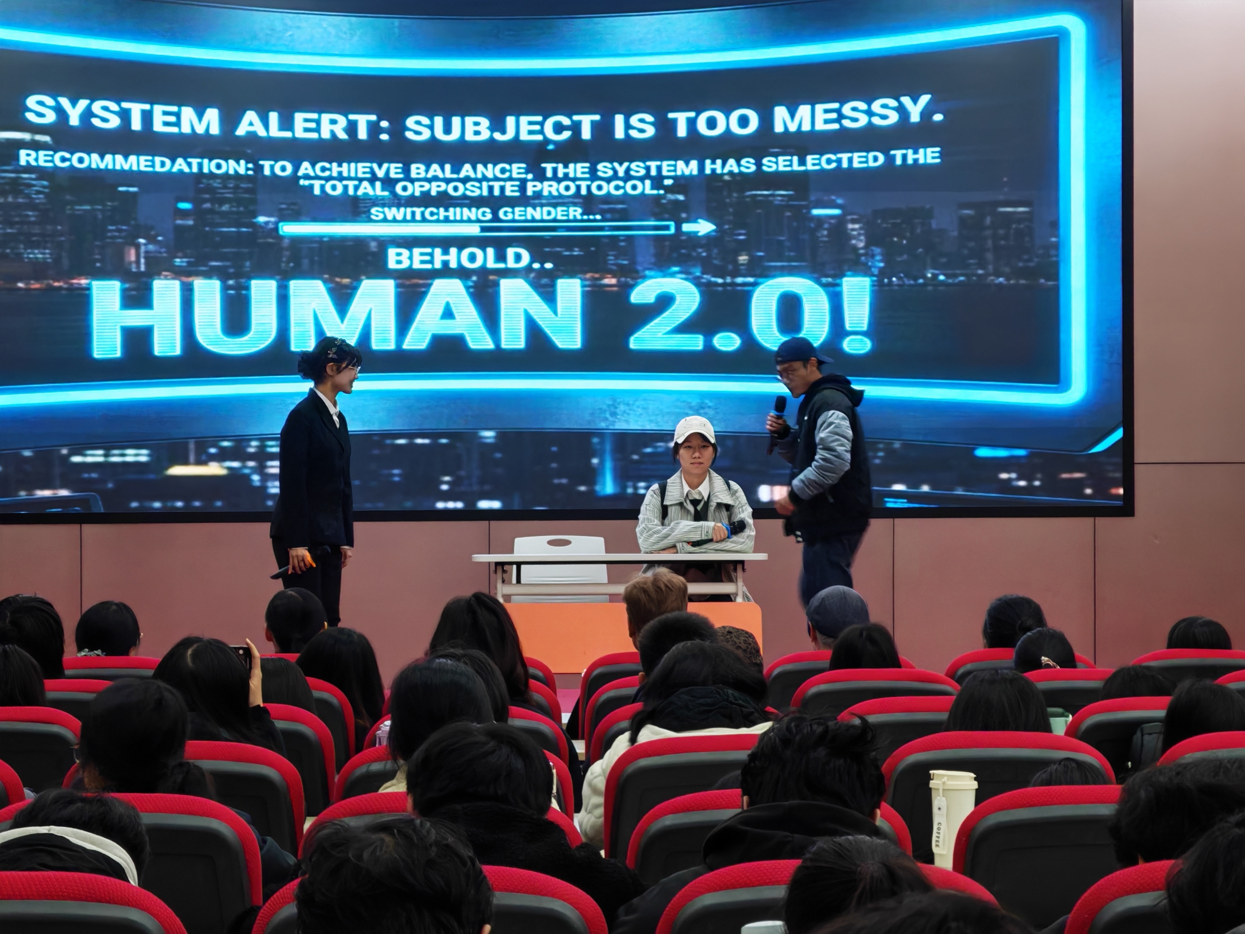 经过班级初选、年级遴选的8组学生团队,将课堂所学转化为兼具深度与创意的现场表达。其中,《跨越国界的通用语言》选取两段不同曲风的《月亮代表我的心》,生动展现中西音乐文化“和而不同”的独特魅力;《电动汽车》围绕电动车与燃油车利弊展开辩论,延伸至百度Apollo Go无人驾驶技术,探讨智能出行的安全、便利与未来可能;《中外婚礼文化差异》聚焦婚俗礼仪、服饰细节,解读文化符号背后的价值内核;《智能机器人》以“Human 2.0”科技发布会为载体,用幽默台词反思技术升级中的人性本质,传递“人性温度高于功能迭代”的深刻思考。