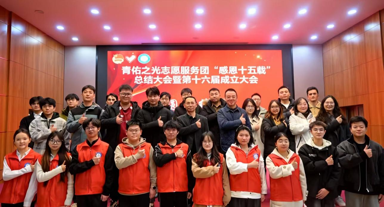 12月14日上午,青佑之光志愿服务团“感恩十五载”总结大会暨第十六届成立大会在大学生活动中心顺利召开。学工部副部长谢晨智、历届指导老师、历任负责人及在校生代表齐聚一堂。大会以服务团十五年发展历程视频开篇,第十五届团支书童正总结过往工作成绩,第十六届团支书谢俊豪围绕“感恩、传承、担当”汇报发展规划,新老成员代表依次登台发言,表达践行志愿精神、服务社会发展的坚定决心。活动最后,团队自编自演的情景剧《光之足迹》,生动呈现了青佑之光十五年来的成长历程与温暖故事。