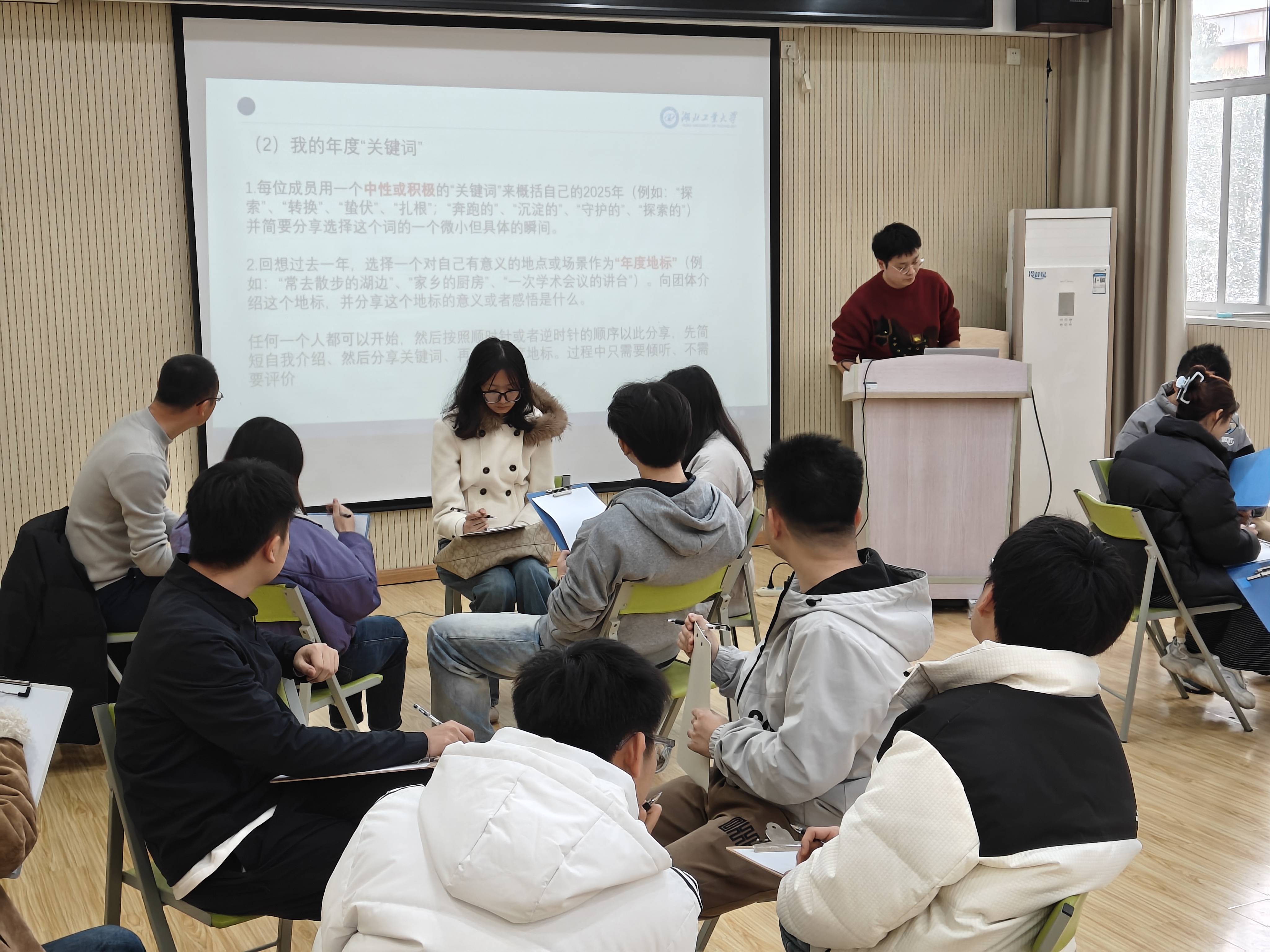 12月30日,党委研工部联合心理健康教育与咨询中心成功举办了一场别开生面的“研途心光——年度复盘与展望团体心理活动”。本次活动由心理教师蔡宇轩带领,机械工程学院、土木建筑与环境学院和经济与管理学院导师代表、研究生辅导员代表以及24名研究生同学参与。