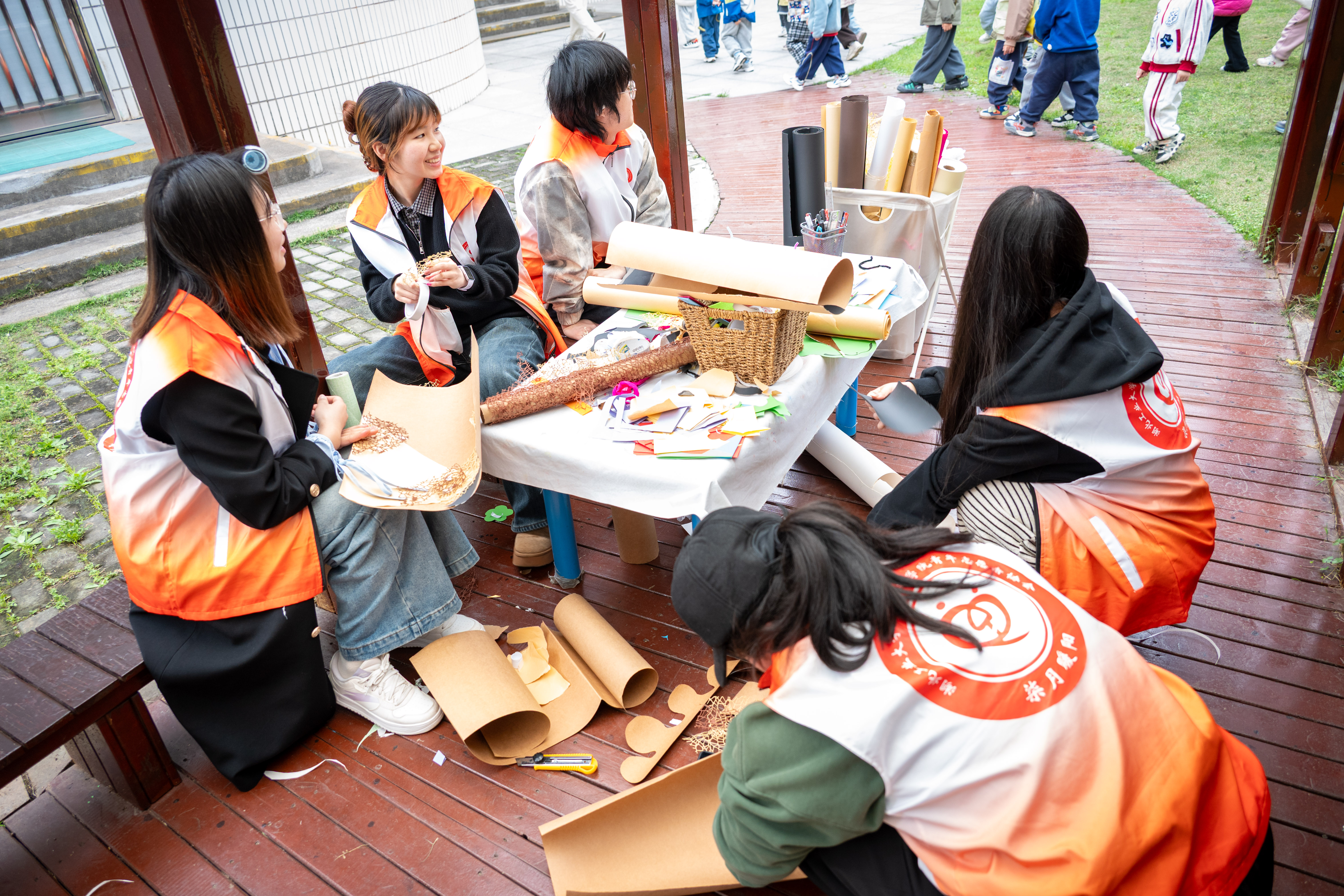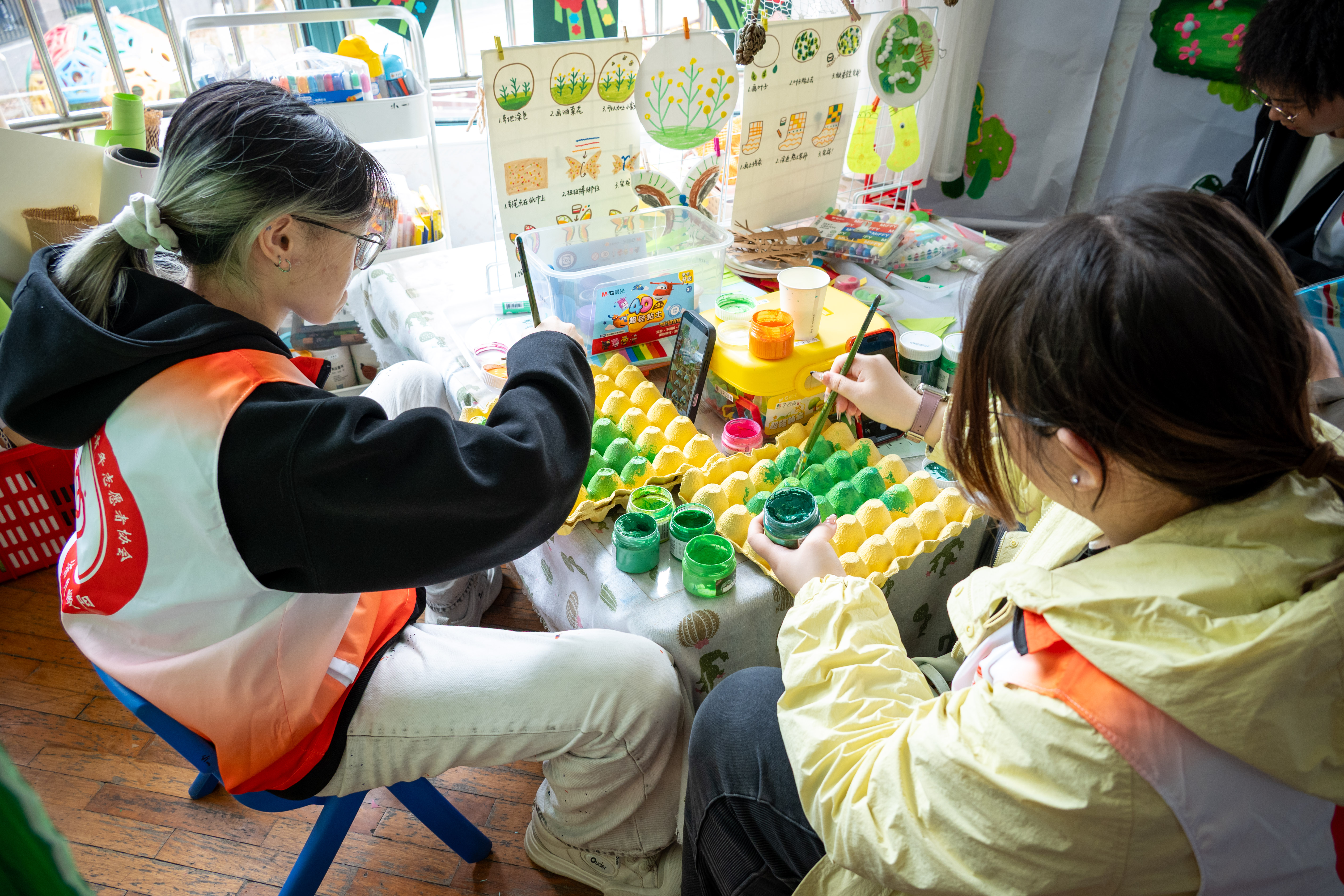 活动现场,志愿者们分工协作,将工业设计的创意思维融入每一个细节。有人以牛皮纸、彩纸为原料,精心裁剪、塑形,打造出立体的装饰造型;有人巧用蛋托、纸盘等环保材料,通过绘制、拼接,制作出趣味绿植、卡通形象等美育教具;还有的专注于色彩调配,为手工材料细致上色,让每一件作品都贴合幼儿的审美趣味。从材料筛选到细节打磨,志愿者们全程兼顾安全性、美观性与教育性。