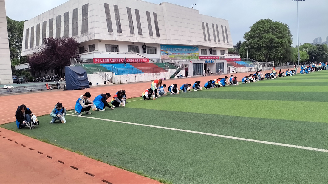 4月16日中午,学校运动场上,百余名学生志愿者在用筷子和夹钳一个个捡起散落的垃圾。这是由学工部、后勤管理处主办,材料与化学工程学院承办的“爱卫同行,净美校园”劳动育人活动现场。