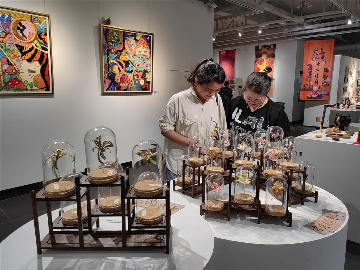 项圈、项链、手环、耳坠、发簪、胸针,这些和田玉雕刻饰品在展览现场,就被订购部分。这十余件玉雕首饰是张卓雅、李念文、拓跋兰君的作品,以梅花、玉兰花、荷花等花卉为雕刻主题。“我们还想让传统玉饰更有现代感。”李念文介绍,为了提升作品的艺术性,三人选择使用具有冷冽感与都市感的银饰作为搭配,达到古典与现代的碰撞。在现场,这样的成熟产品不少,包括镜子、盲盒、帆布袋等。