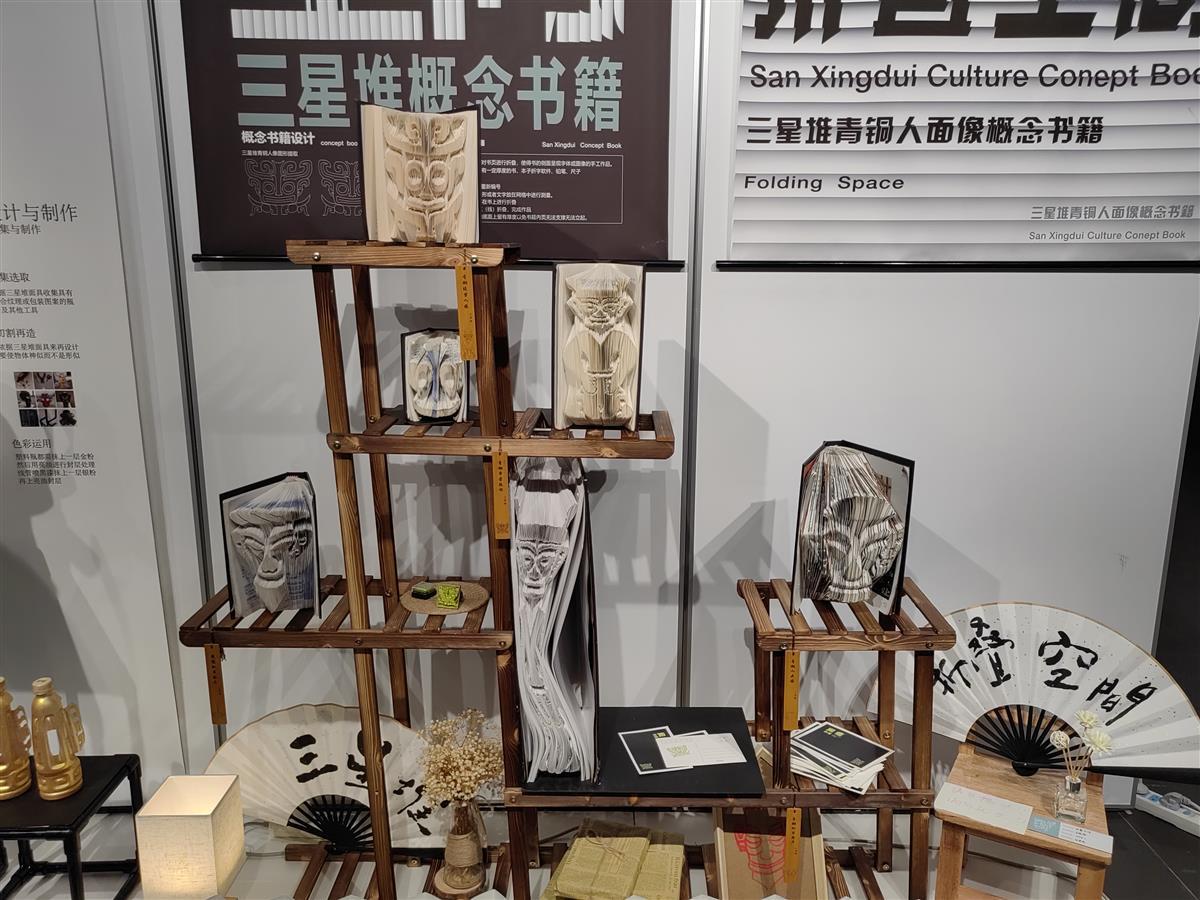 书籍和三星堆会产生怎样的“反应”?三星堆概念书籍将书籍的内页折叠,呈现了戴冠纵目面具、盘辫青铜人像、青铜跪坐人像等多个三星堆青铜人像的模样,连表情和神态都各异。在此次设计艺术展上,这样天马行空的创意非常多。