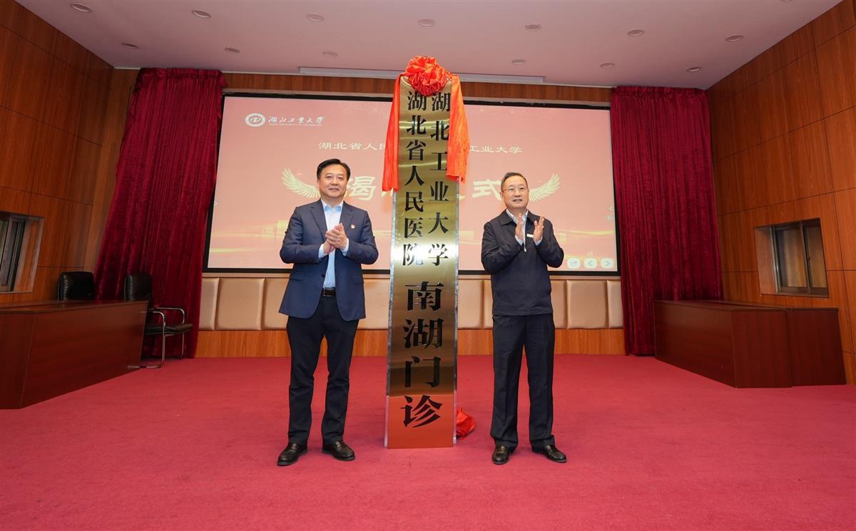 现场,湖北工业大学校医院党总支书记任卫华与湖北省人民医院党委常委、副院长耿庆教授共同签署《合作协议》,湖北工业大学党委书记彭育园与省人民医院党委书记万红慧共同为“南湖门诊”揭牌。