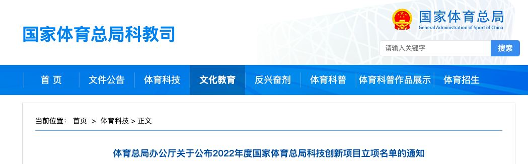 国家体育总局网站信息显示,2022年度国家体育总局科技创新项目已完成专家评审、网上公示等程序,经体育总局批准,确定立项项目共计100项。项目类别分为创新研发项目、国家队科研攻关项目、科技成果转化项目三类。