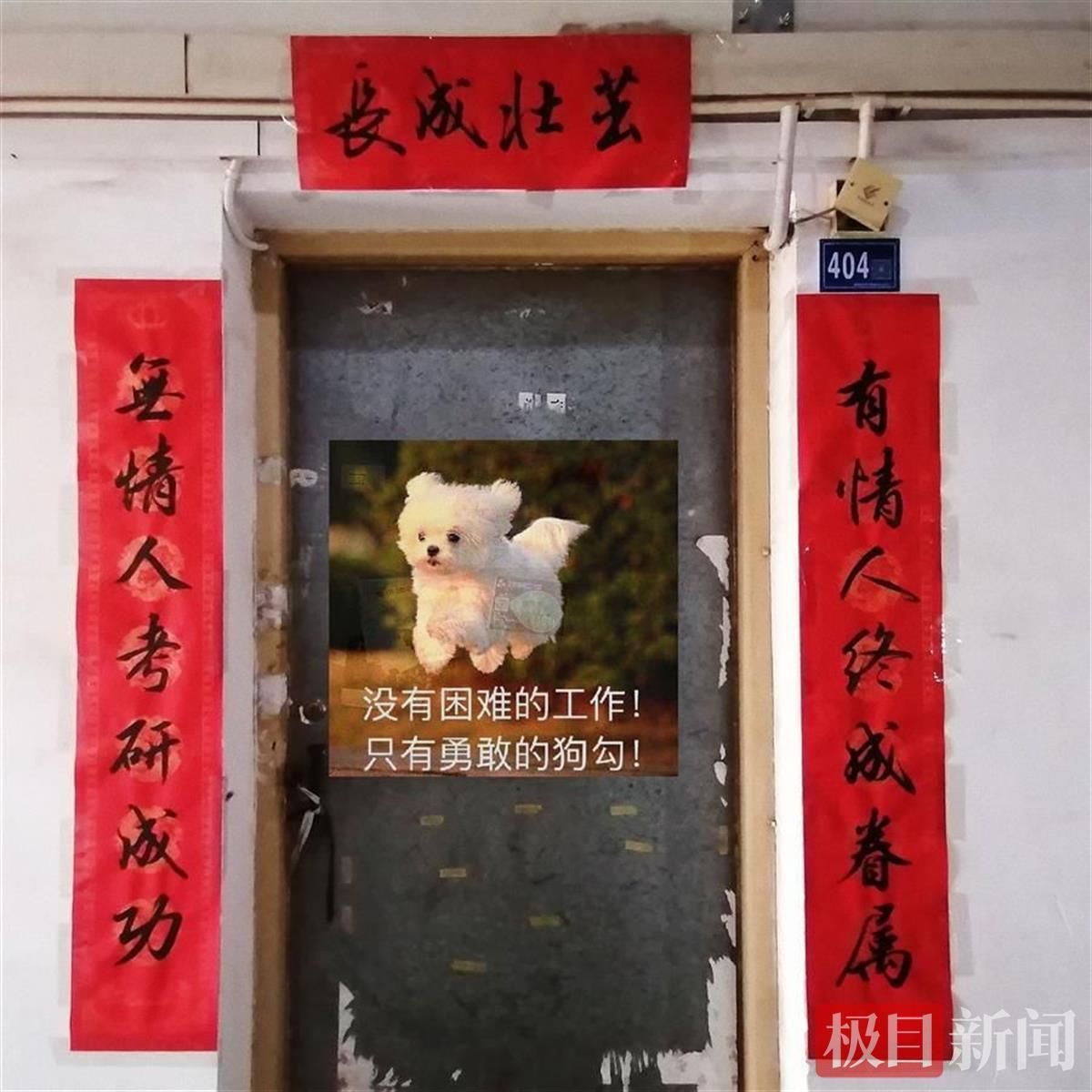 上联:有情人终成眷属,下联:无情人考研成功,横批:茁壮成长。走过湖北工业大学草莓园四栋404寝室前,许多人都看着宿舍门前的对联会心一笑。近日,好消息传来,该寝室的四名女生,全部完成诺言,“无情”成功上岸。