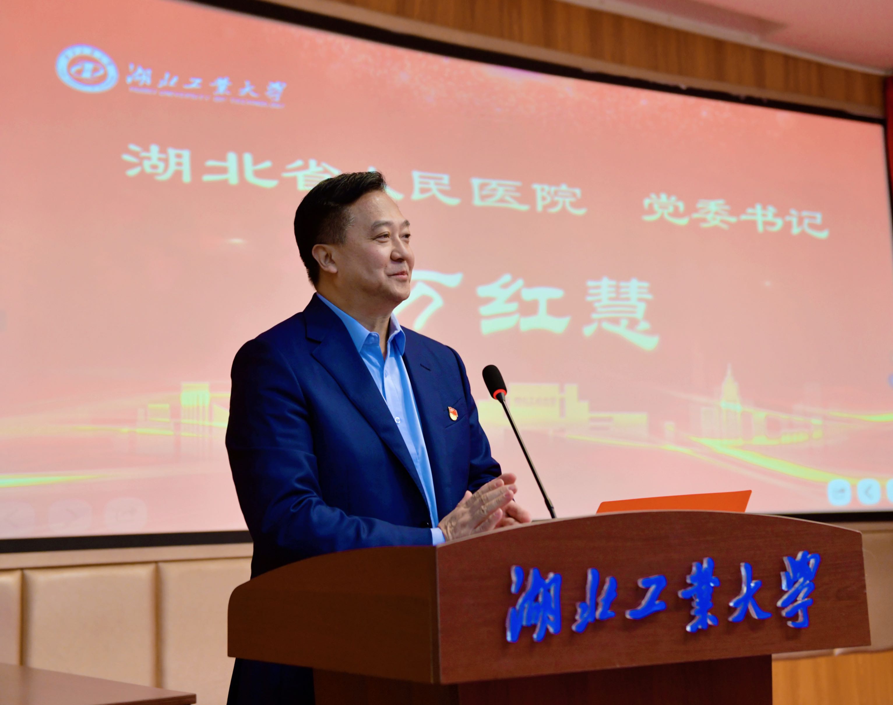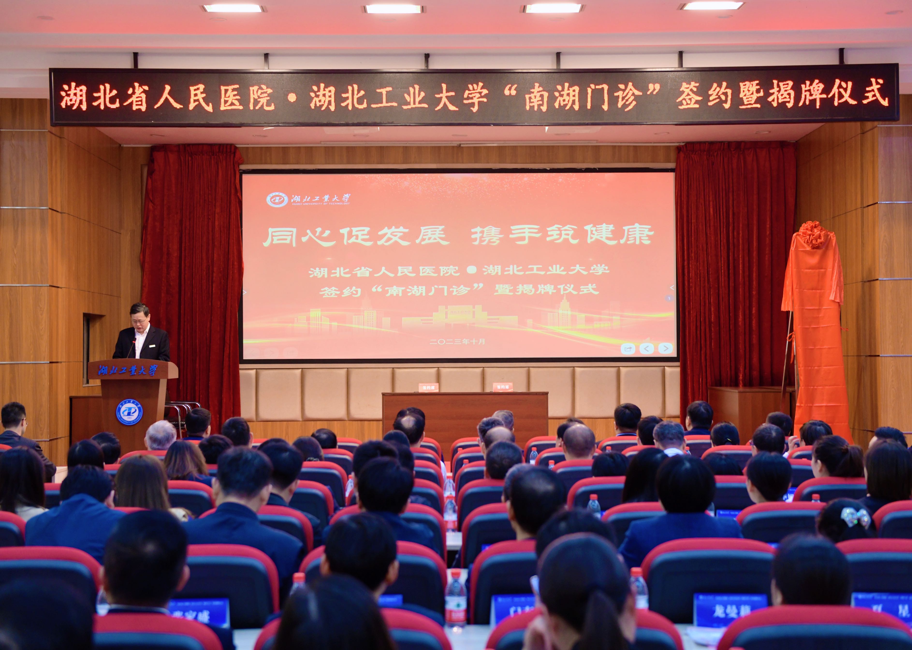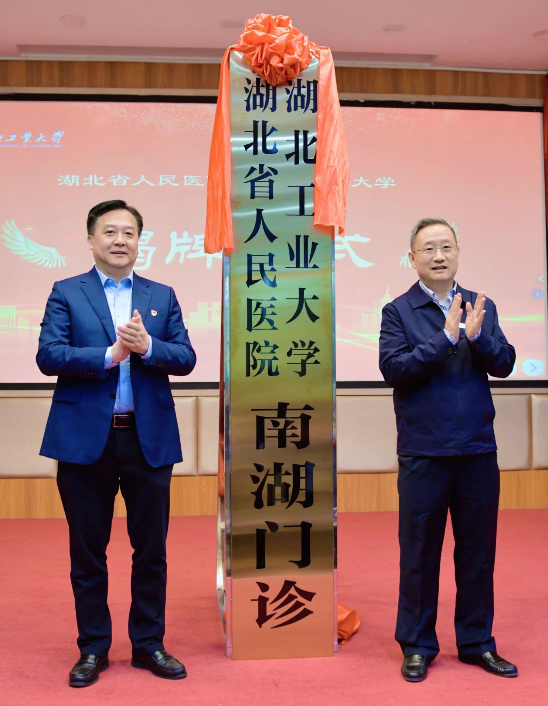 湖北省人民医院党委书记万红慧、湖北工业大学党委书记彭育园共同为“南湖门诊”揭牌。省人民医院副院长耿庆和湖工大校医院党总支书记任卫华签署医联体合作协议。