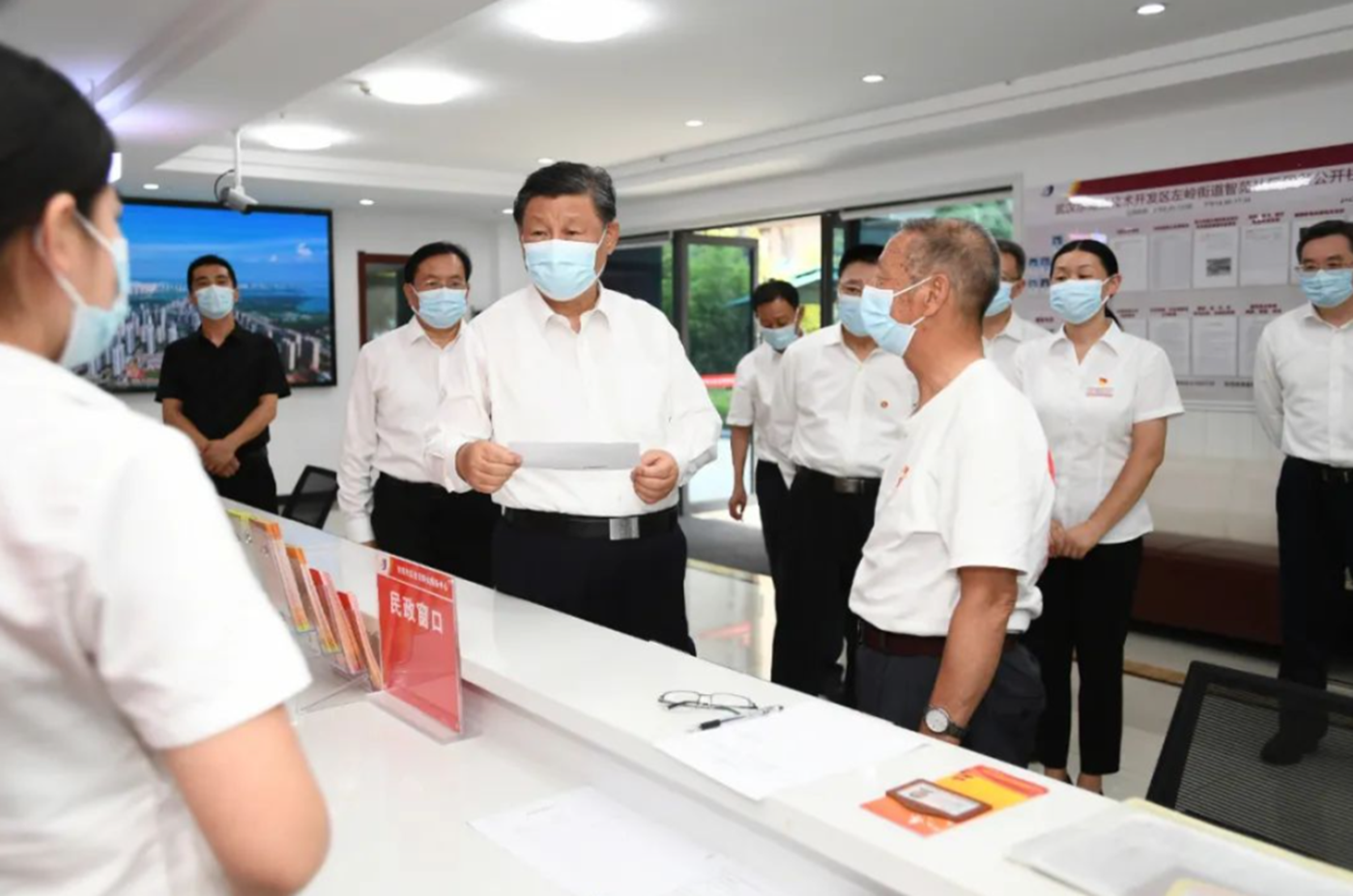 2022年6月28日,中共中央总书记、国家主席、中央军委主席习近平在湖北省武汉市考察。这是28日下午,习近平在东湖高新区左岭街道智苑社区党群服务中心,向社区工作者了解党建引领基层社区治理及便民服务等情况,并同前来办事的老年人亲切交谈。