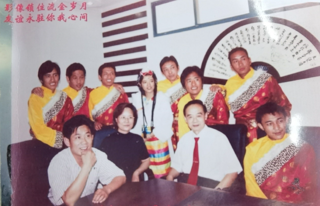2003年土木工程系元旦晚会结束后,8名藏族学生和老师合影。前排为土木工程系辅导员唐良辉(左一),党总支书记刘平华(左二)、土木工程系余天庆教授(左三),后排右四为次旦卓玛,后排右三为一起拾金不昧的仁增曲扎。(魏忠德翻拍)
