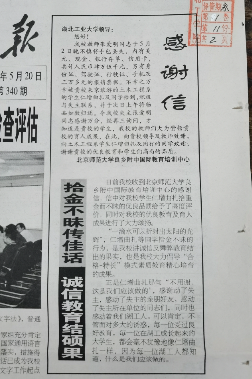 2004年5月20日,湖北工业大学校报刊登次旦卓玛等3位藏族学生拾金不昧的事迹。魏忠德 摄
