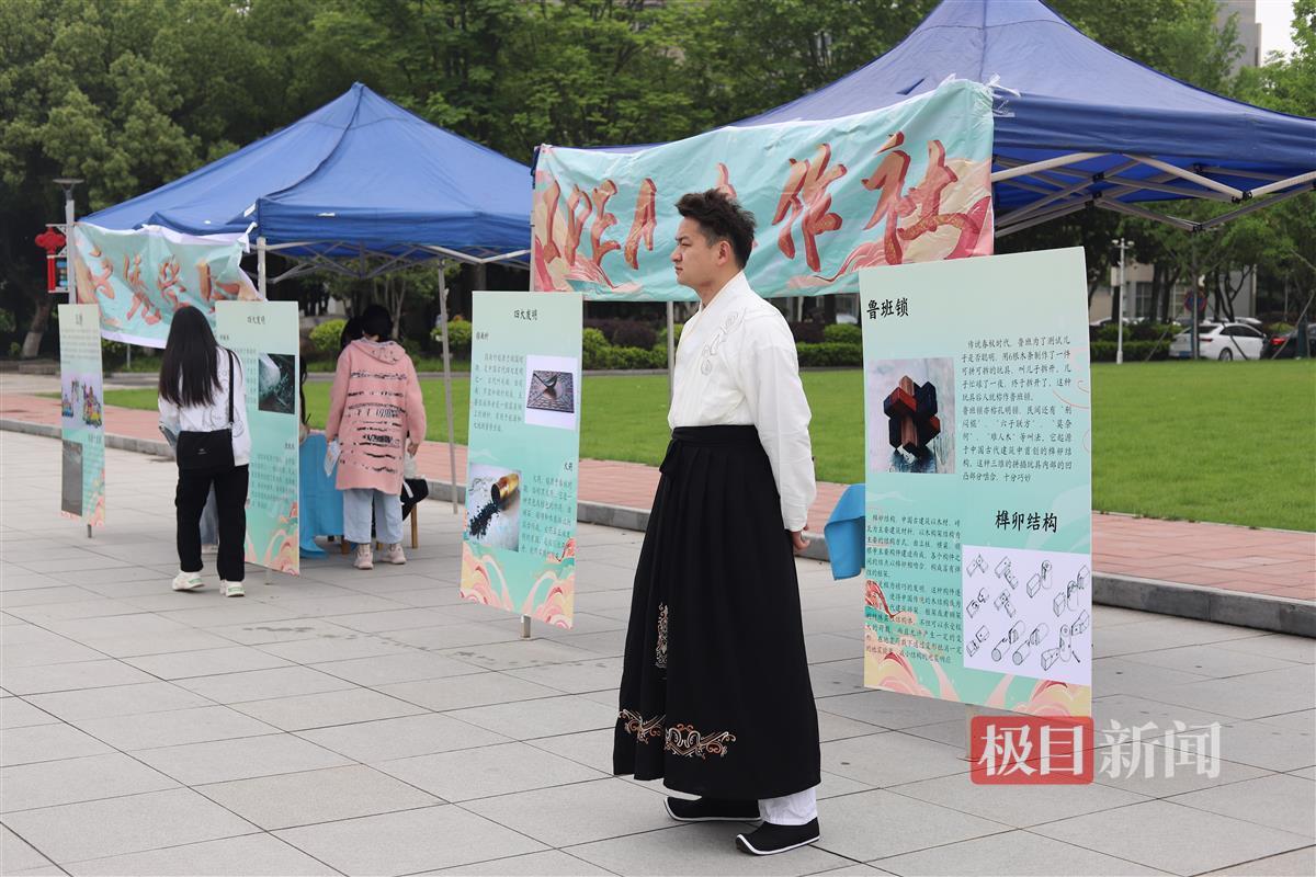 披帛云肩,广袖长袍。所谓“服章之美谓之华”。墨染春秋华服社的展台上展览着不同朝代的汉服,“衣冠上国礼仪之邦。华夏民族绵延数千年,服饰文化多姿多彩。”汉服社负责人税秭英向我们介绍道,“秦汉的服饰呈现出端庄、典雅的风格。魏晋轻灵飘逸、素雅有个性。唐制汉服雍容华贵,宋制含蓄简约极富出尘之意,明制优雅大方,高贵不失典雅。”