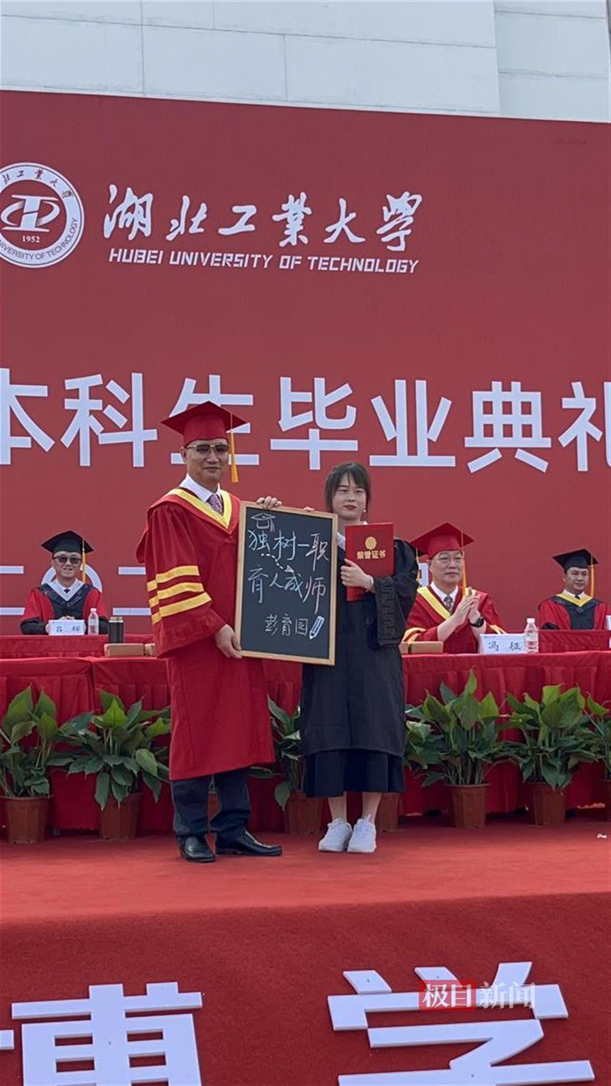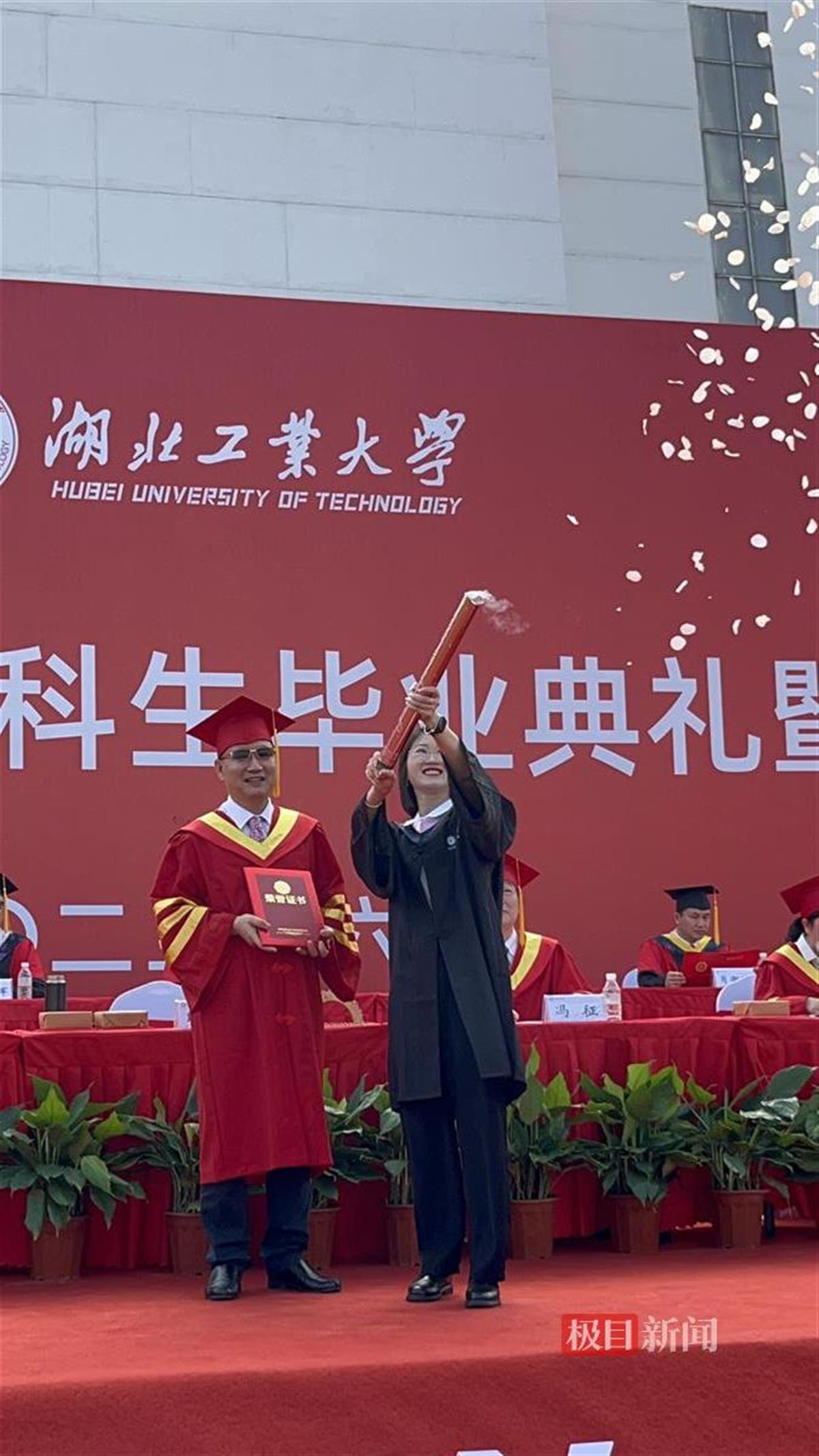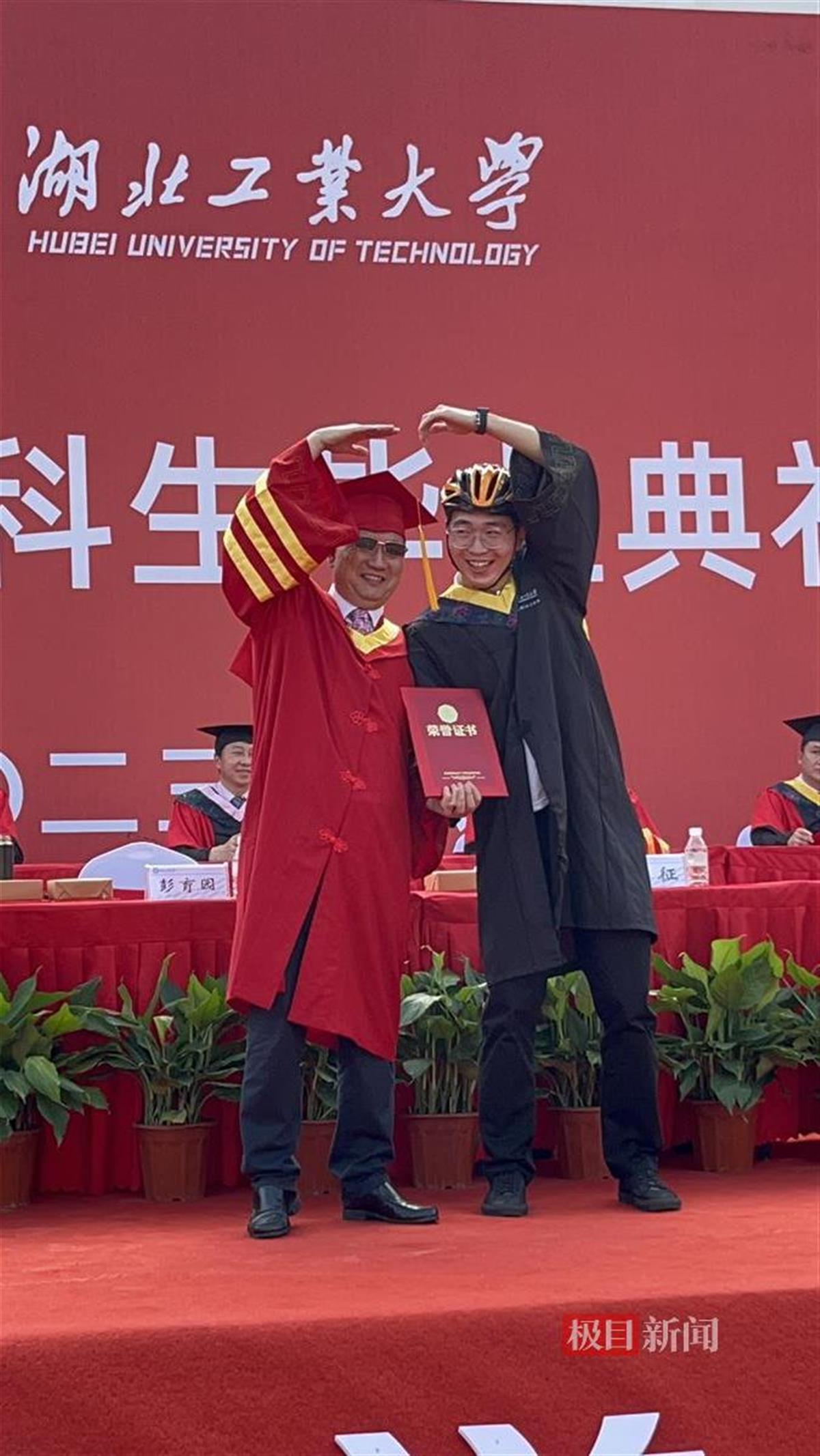 “机械学院陈云健,他是‘机械创新设计大赛’全国一等奖获得者,毕业后将前往西北工业大学仪器仪表工程专业继续深造。他带着自己做的机器人走上舞台……”6月20日清晨,湖北工业大学中区操场,热闹的毕业典礼正热火朝天地举行。在优秀毕业生上台领奖环节,该校最优秀的“显眼包”们,带着自己学院最具特色的小物件一同上台。