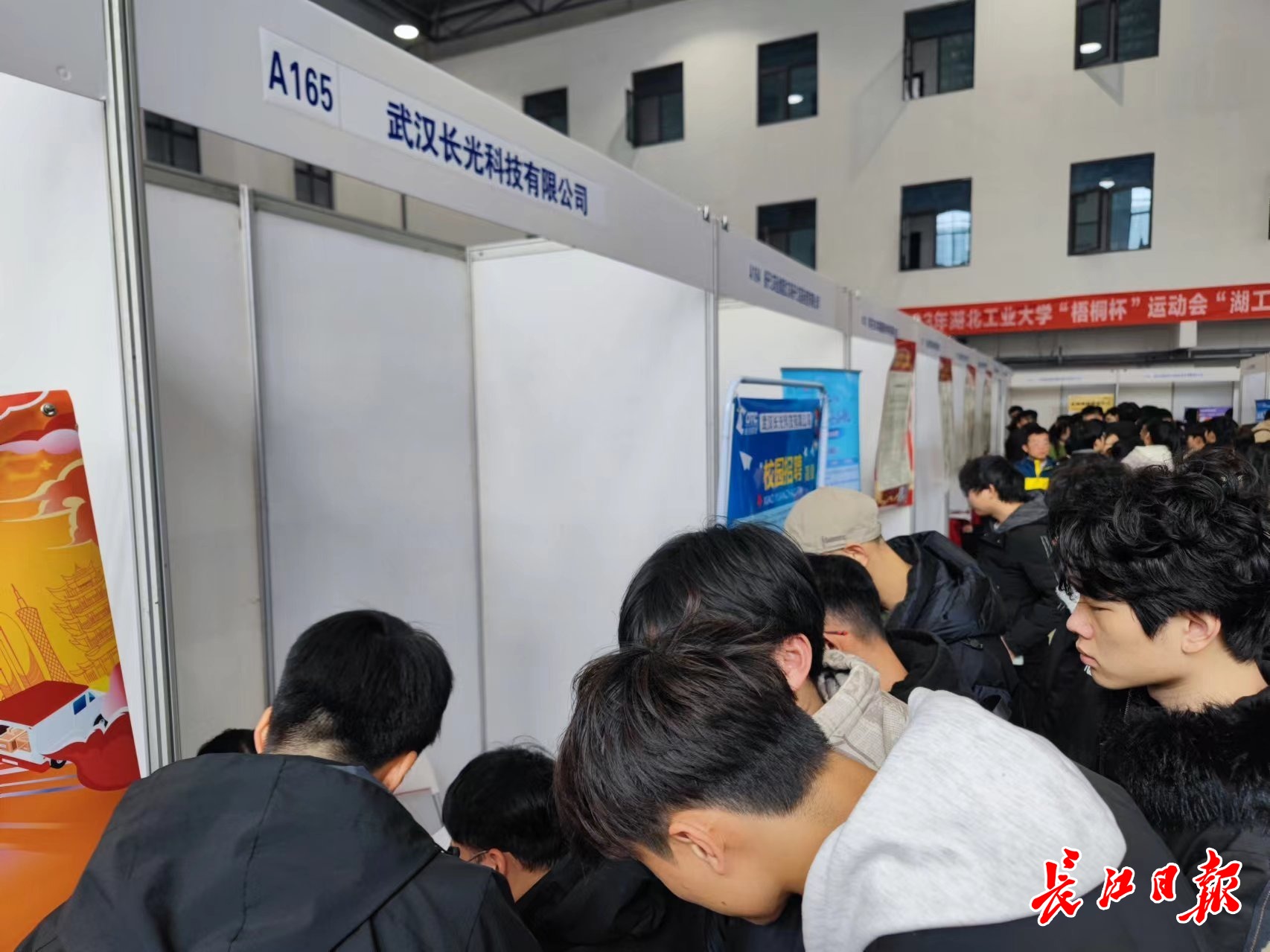 中午时分,武汉长光科技有限公司的展位仍被学生围得水泄不通,这家位于东湖高新技术开发区的企业招聘的岗位包括嵌入式软件开发工程师、硬件开发工程师、软件测试工程师、国际销售代表等,学历要求既有本科也有专科,月薪6000元至15000元,吸引众多学生咨询、投递简历。
