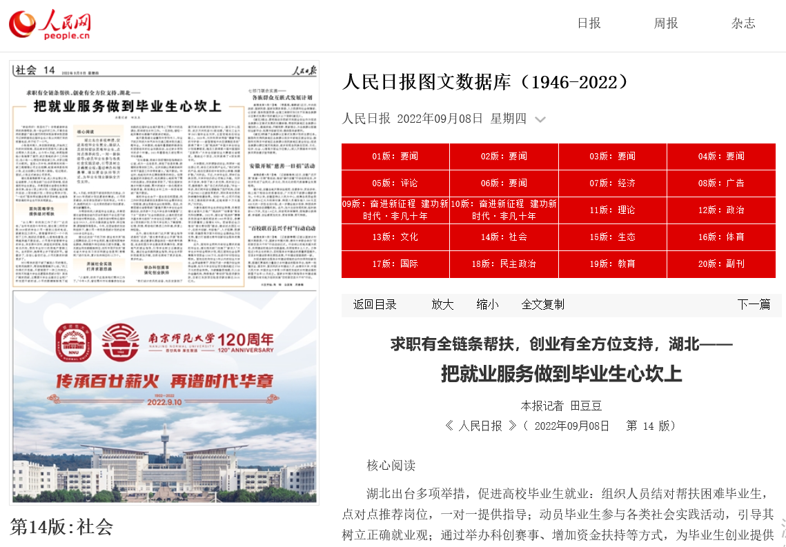 http://paper.people.com.cn/rmrb/html/2022-09/08/nw.D110000renmrb_20220908_1-14.htm【人民日报】求职有全链条帮扶,创业有全方位支持,湖北——把就业服务做到毕业生心坎上