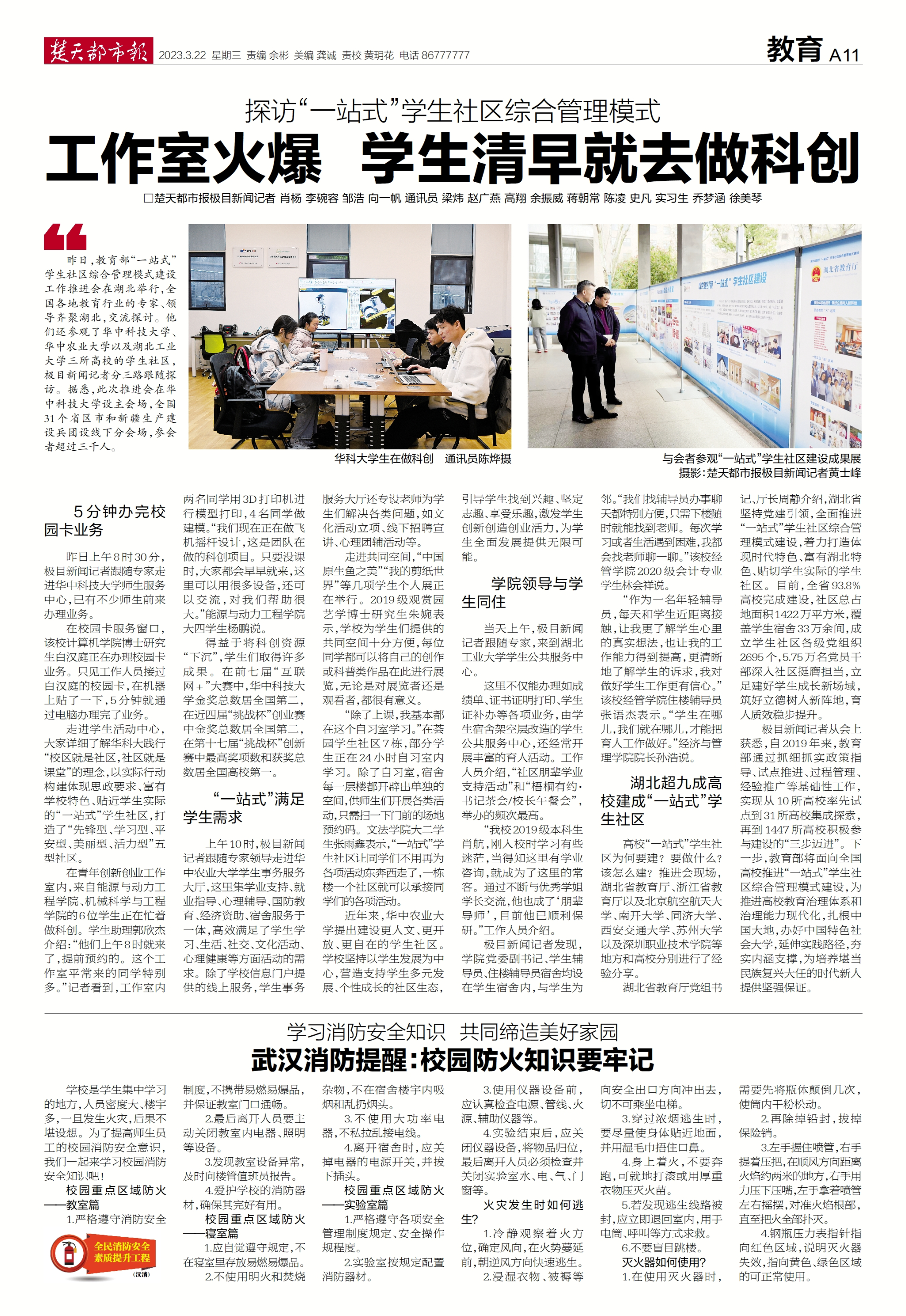 湖北省教育厅党组书记、厅长周静介绍,湖北省坚持党建引领,全面推进“一站式”学生社区综合管理模式建设,着力打造体现时代特色、富有湖北特色、贴切学生实际的学生社区。目前,全省93.8%高校完成建设,社区总占地面积1422万平方米,覆盖学生宿舍33万余间,成立学生社区各级党组织2695个,5.75万名党员干部深入社区挺膺担当,立足建好学生成长新场域,筑好立德树人新阵地,育人质效稳步提升。