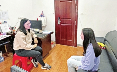 在学院党委副书记的宿舍办公室,辅导员和学生交流谈心。