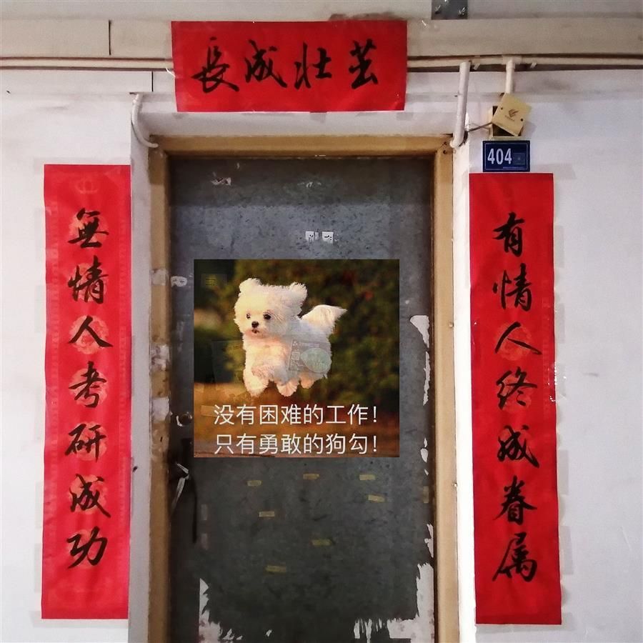 “贴对联是我们404寝室的传统。”杨梅杰介绍,从大一开始,每年寒假前的大扫除,她们都会在寝室门口贴对联。去年元旦换新对联时,杨梅杰灵机一动:“既然大家都是单身,又决定要考研,不如换成‘有情人终成眷属,无情人考研成功’吧!”室友们当时就被逗乐了,大家拍手称好,一致通过。