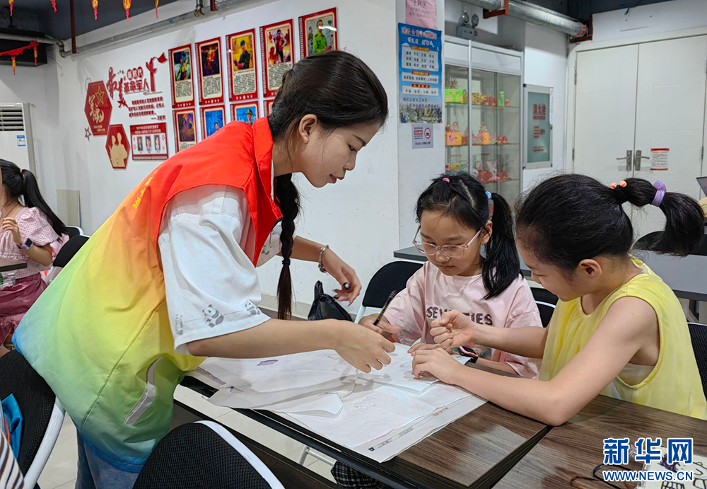 湖北工业大学学子参加社会实践指导小朋友学习绘画。新华网发(湖北工业大学供图)