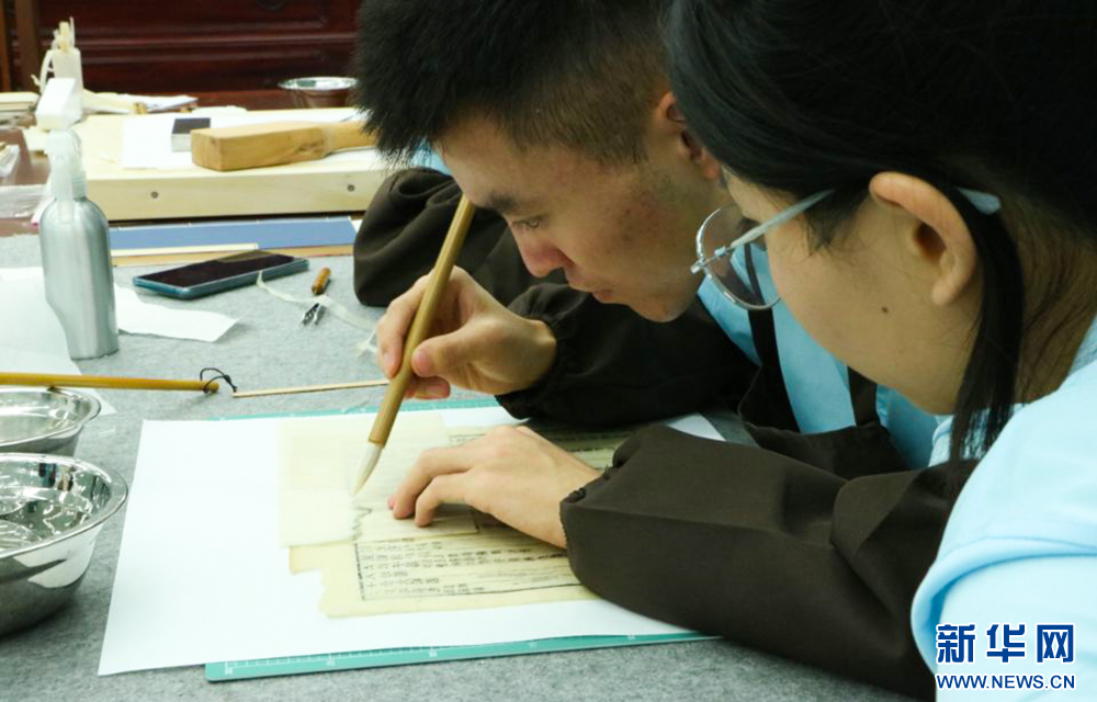 湖北工业大学学子参与古籍修复实践。新华网发(湖北工业大学供图)