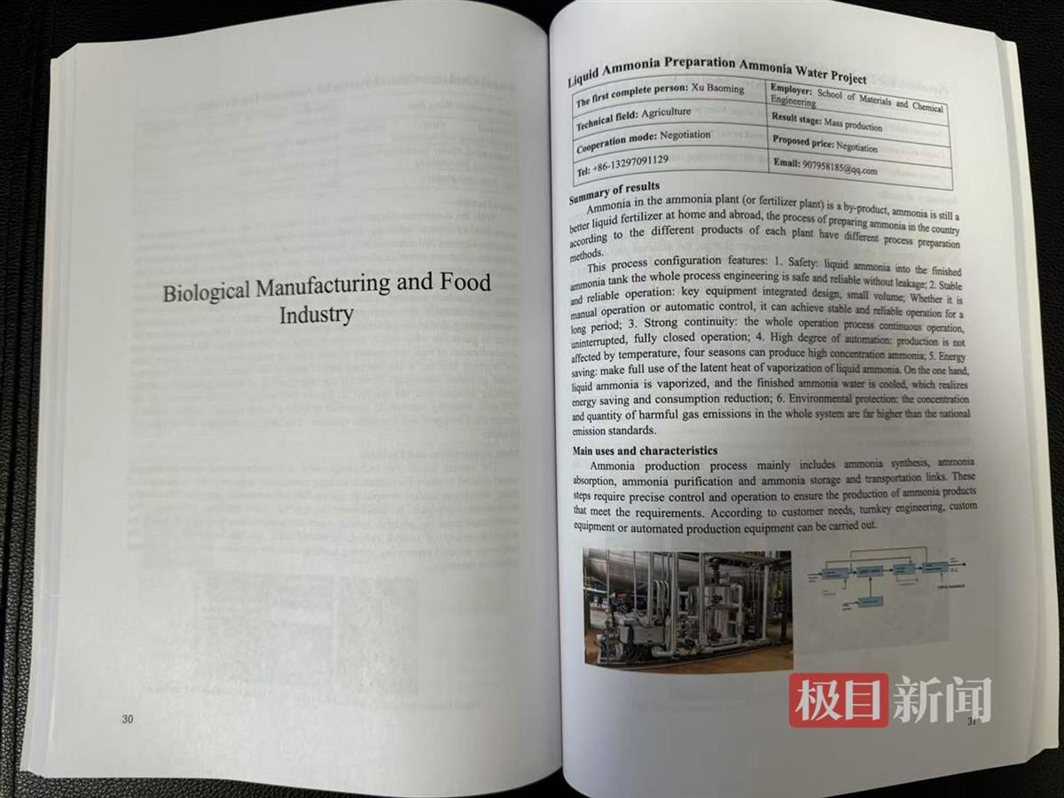 极目新闻记者现场看到,这本册子厚达157页,142个项目各自占据一页,页面上,第一完成人、技术领域、成果阶段、合作方式、拟定价格、联系电话、电子邮箱、成果简介、主要用途和特点等都被清晰标注、介绍。“这个方式好,我们也可以学习!”一位特意来现场观摩的南昌航空大学老师说。