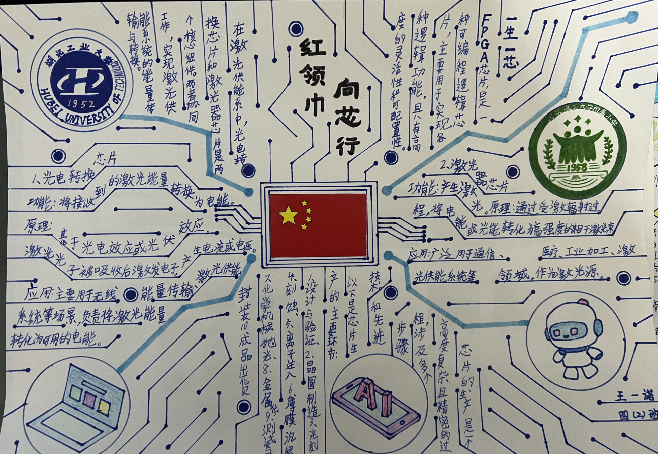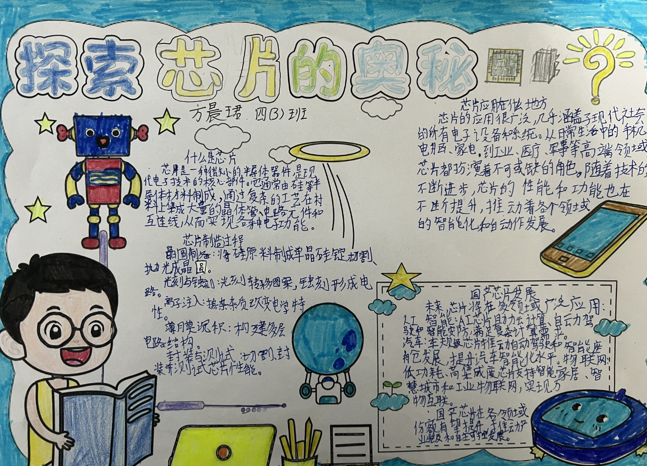 2月26日,湖北工业大学芯片产业学院教授姚育成收到武汉理工大学附属小学教师吴婷婷发来的一份特殊“礼物”——一组来自该校学生绘制的芯片主题手抄报。这些手抄报内容丰富、设计精美,稚嫩的笔触饱含着孩子们对芯片领域的探索热情。吴婷婷告诉姚育成:“孩子们让我代表他们谢谢湖工大的老师,是你们用生动有趣的科普课点燃了他们对芯片知识的好奇。”