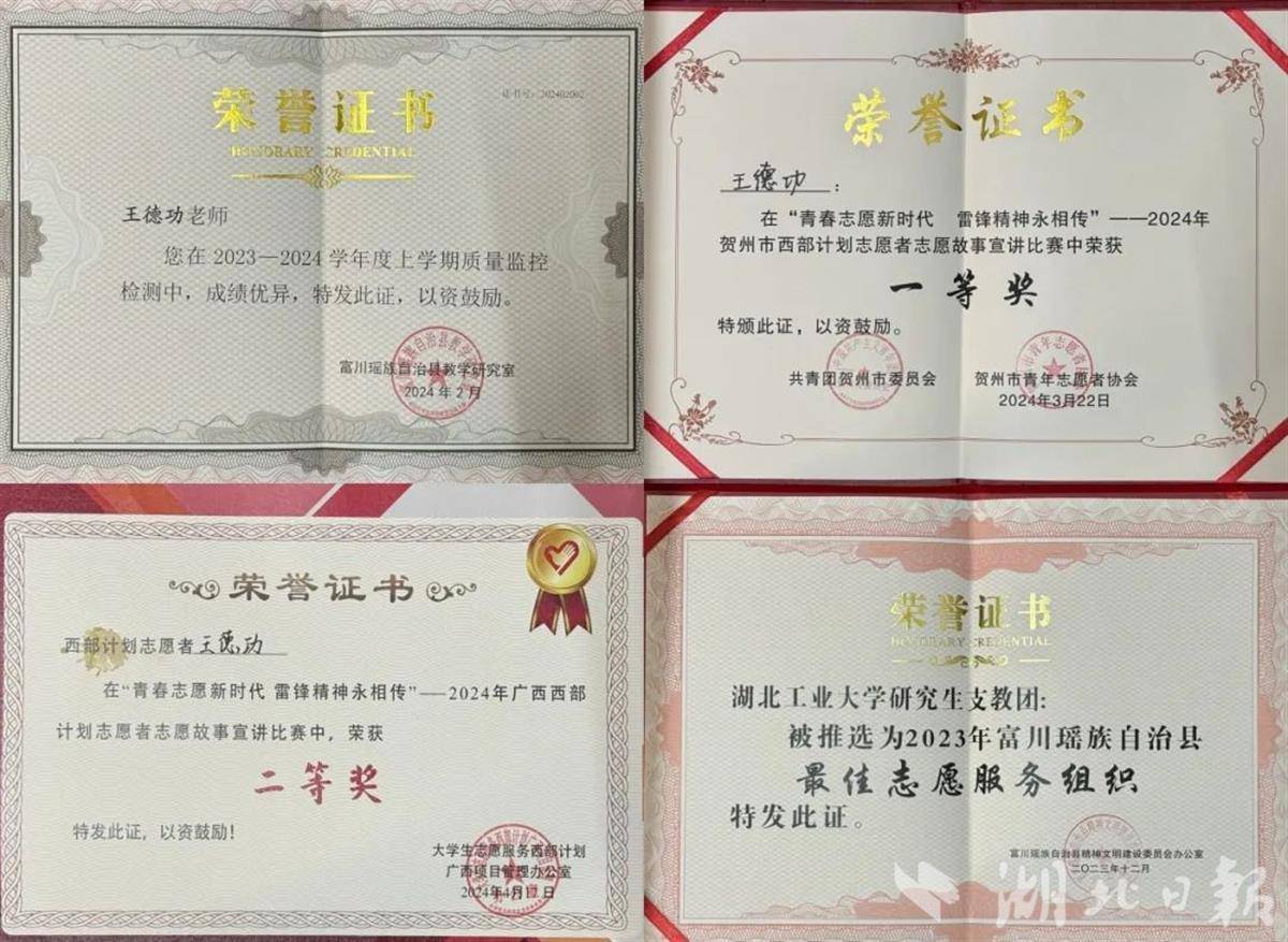 据介绍,王德功的英雄壮举并非偶然,大一他就加入初芒志愿服务队,目前志愿服务时长已达3714小时。大二时,王德功参军入伍,服役期间表现优异,荣获“优秀士兵”称号。本科毕业后,他又主动报名参加研究生支教团,在广西富川支教一年,获全国大学生志愿服务西部计划“优秀志愿者”。