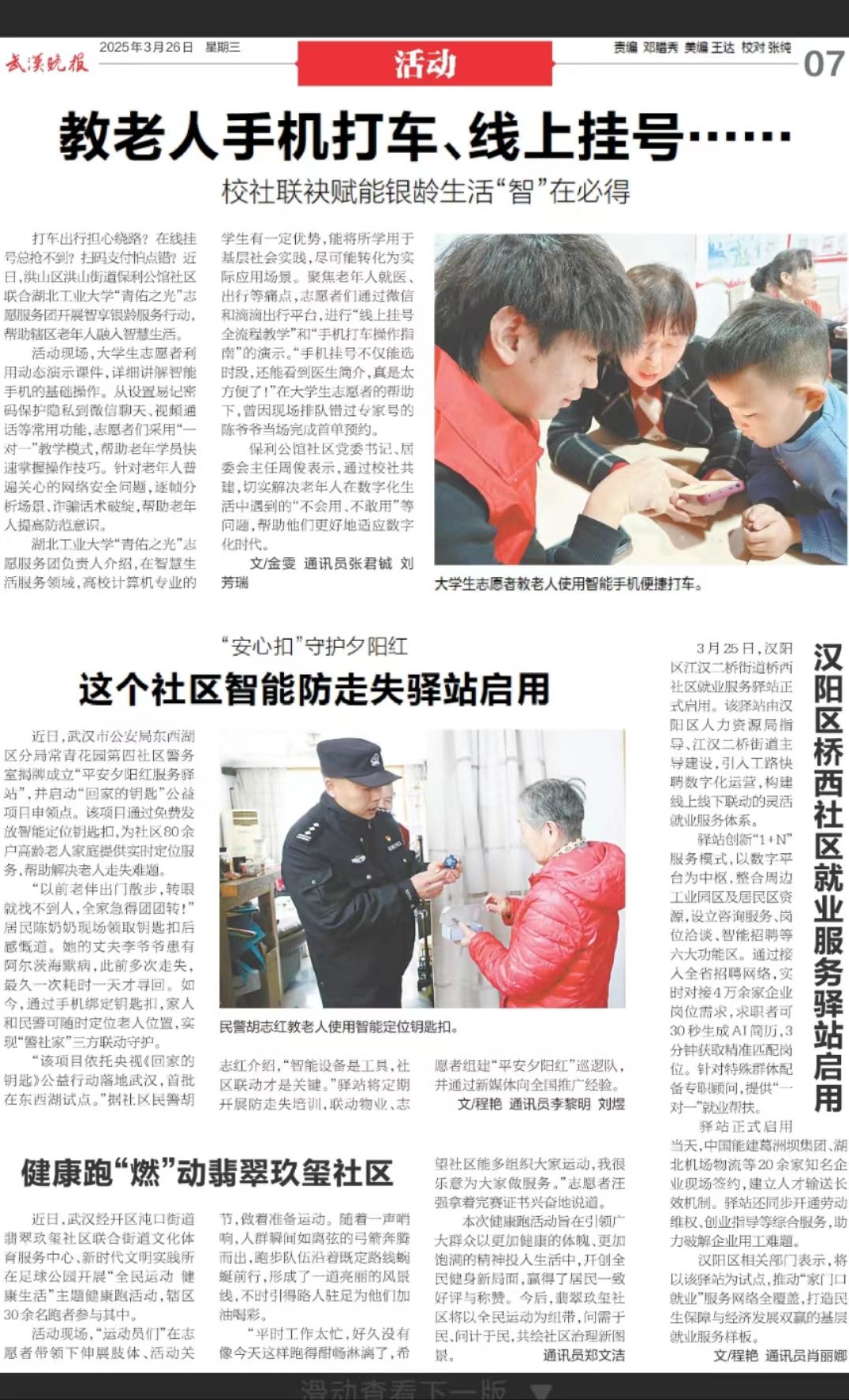 湖北工业大学“青佑之光”志愿服务团负责人介绍,在智慧生活服务领域,高校计算机专业的学生有一定优势,能将所学用于基层社会实践,尽可能转化为实际应用场景。聚焦老年人就医、出行等痛点,志愿者们通过微信和滴滴出行平台,进行“线上挂号全流程教学”和“手机打车操作指南”的演示。“手机挂号不仅能选时段,还能看到医生简介,真是太方便了!”在大学生志愿者的帮助下,曾因现场排队错过专家号的陈爷爷当场完成首单预约。