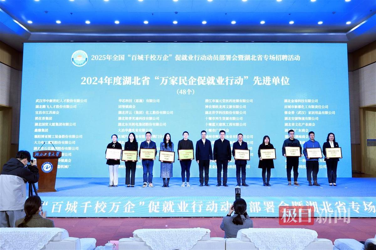 在2025年度“百城千校万企”促就业行动动员部署会上,还通报表扬48家湖北省“万家民企促就业”行动先进单位并授牌。盛隆电气副董事长谢清伦、湖北东贝机电集团股份有限公司董事长姜敏、湖北祥云(集团)化工股份有限公司董事长胡华文等作为企业代表上台交流发言,分享招才引才聚力高质量发展的经验。