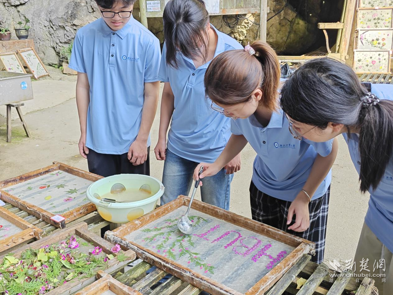 穿洞溶窟中,恒温泉水滋养着世界唯一的溶洞造纸工坊。指导老师向同学们讲解丹寨古法造纸的“三个唯一”:唯一溶洞造纸、唯一花草纸、唯一迎春纸。在师傅的指导下,队员们将纸浆均匀铺展于竹帘,然后小心翼翼地将野花细草嵌入纸胎,再覆以薄浆。一幅幅独一无二的花草“画卷”在阳光下诞生。“原来花草纸的制作这么艰难!”队员余孟怀抚摸着作品感慨。