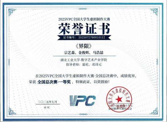 2025VPC全国大学生虚拟制作大赛全国总决赛日前在海南陵水落幕,湖北工业大学数字艺术产业学院《界限》剧组获得全国一等奖。