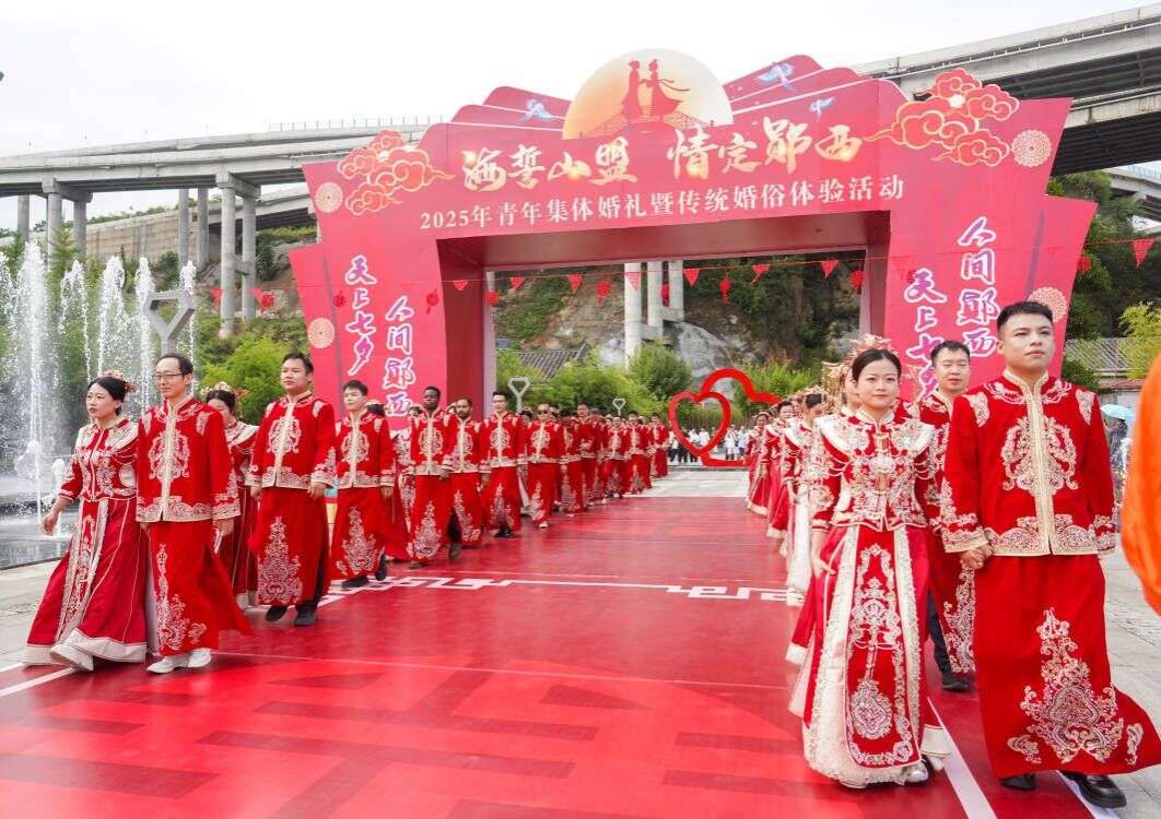 8月28日,湖北省郧西县天河之畔清风拂面、礼乐悠扬,77对来自全国各地的新人齐聚于此,共赴“海誓山盟・情定郧西”青年集体婚礼,以古韵十足的仪式定格爱情最美模样。