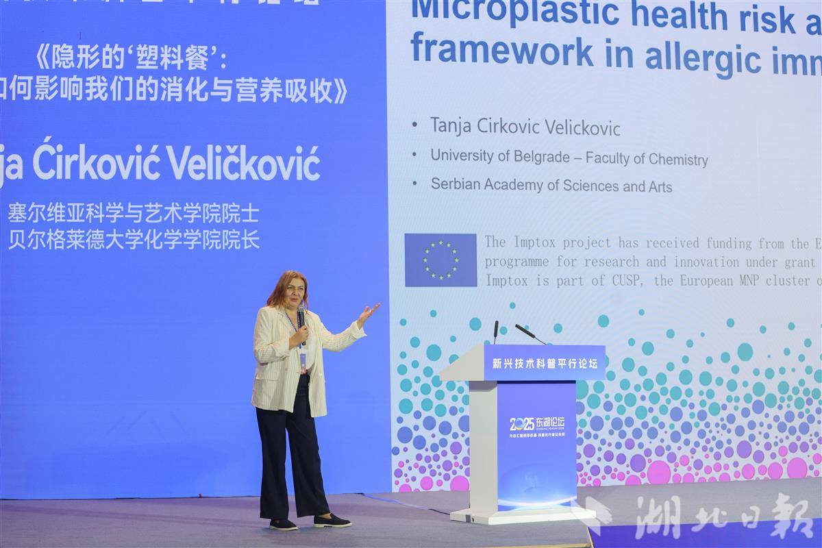 10月14日,在2025东湖论坛新兴技术科普平行论坛上上,国际知名蛋白质化学与精准营养学家、塞尔维亚科学与艺术学院院士、贝尔格莱德大学化学学院院长塔倪娅·奇尔科维齐·韦利奇科维奇发表了题为《隐形的"塑料餐":微塑料如何影响我们的消化与营养吸收》的主题报告,揭示了微塑料污染对人类健康构成的严重威胁。