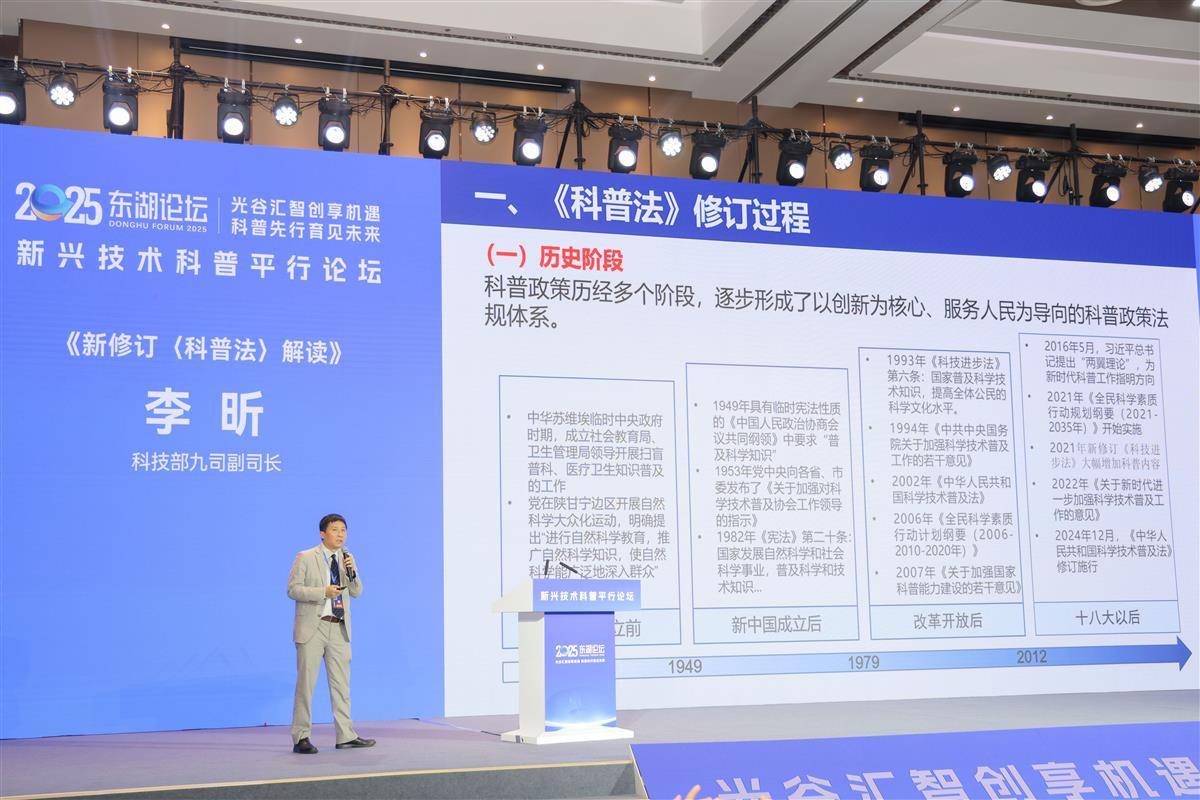 湖北日报讯(记者陈熹、通讯员陈凌)“我国现行成文法律大概300多部,其中三部与科技有关——《科学技术进步法》《科技成果转化法》,以及《科学技术普及法》。经过20多年,《科普法》完成了一次大修。”10月14日,在2025东湖论坛新兴技术科普平行论坛上,科技部九司副司长李昕介绍,新修订的《科普法》从原来的六章三十四条扩展到六十条,条文数量接近翻倍,并首次增加了“科普人员”和“科普活动”两个专章。