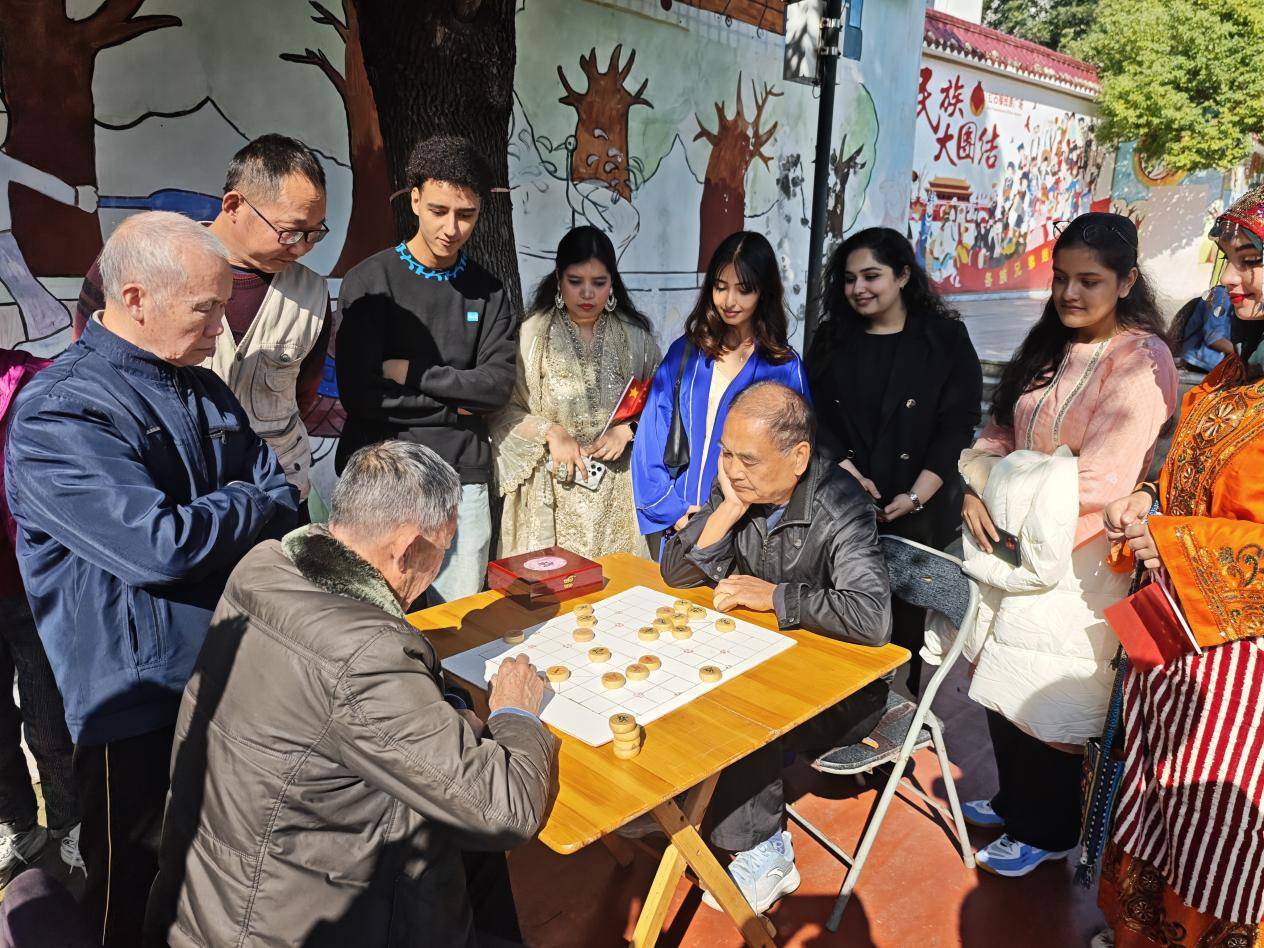 随后,社区居民和外国留学生围坐在一起,热情地分享我国重阳节等传统文化习俗,了解中国象棋文化。外国留学生们则纷纷拿出自己国家的特色物品,有色彩斑斓的手工编织品,还有带着神秘图案的传统服饰,一边展示一边讲述着背后的文化故事。