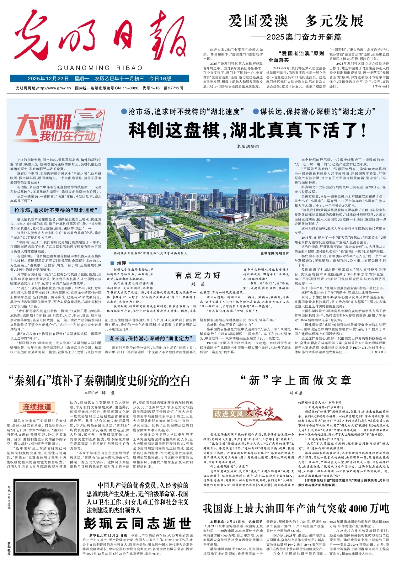 12月22日,《光明日报》头版刊发文章《科创这盘棋,湖北真真下活了!》,聚焦湖北科技创新的故事,展现从深耕基础研究、科技成果赋权改革到引领产业未来发展的强劲动能。