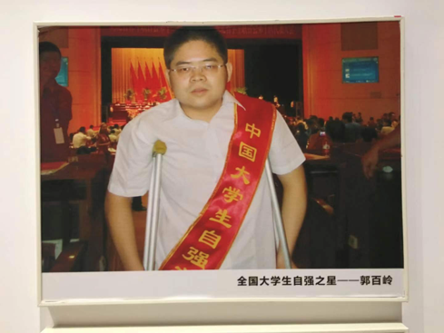 小时候,郭百岭每天挪着半人高的小板凳,代替双脚上学。中学时,父母踩着三轮车,风雨无阻地送他去学校。