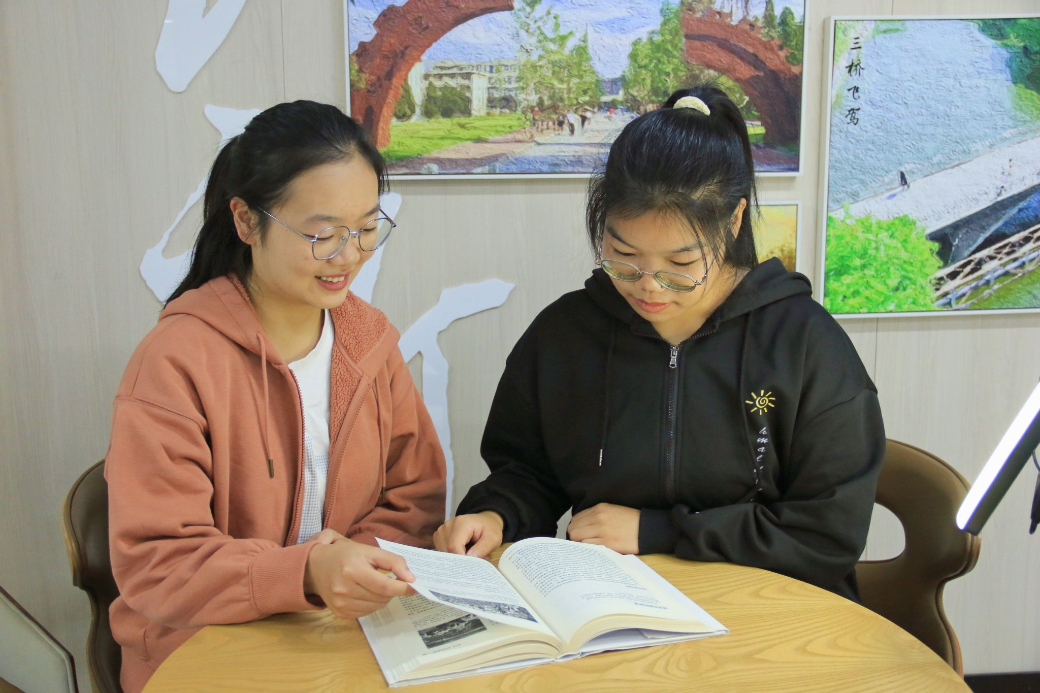 饶玉洁(左)和肖梦娜(右)一块交流学习