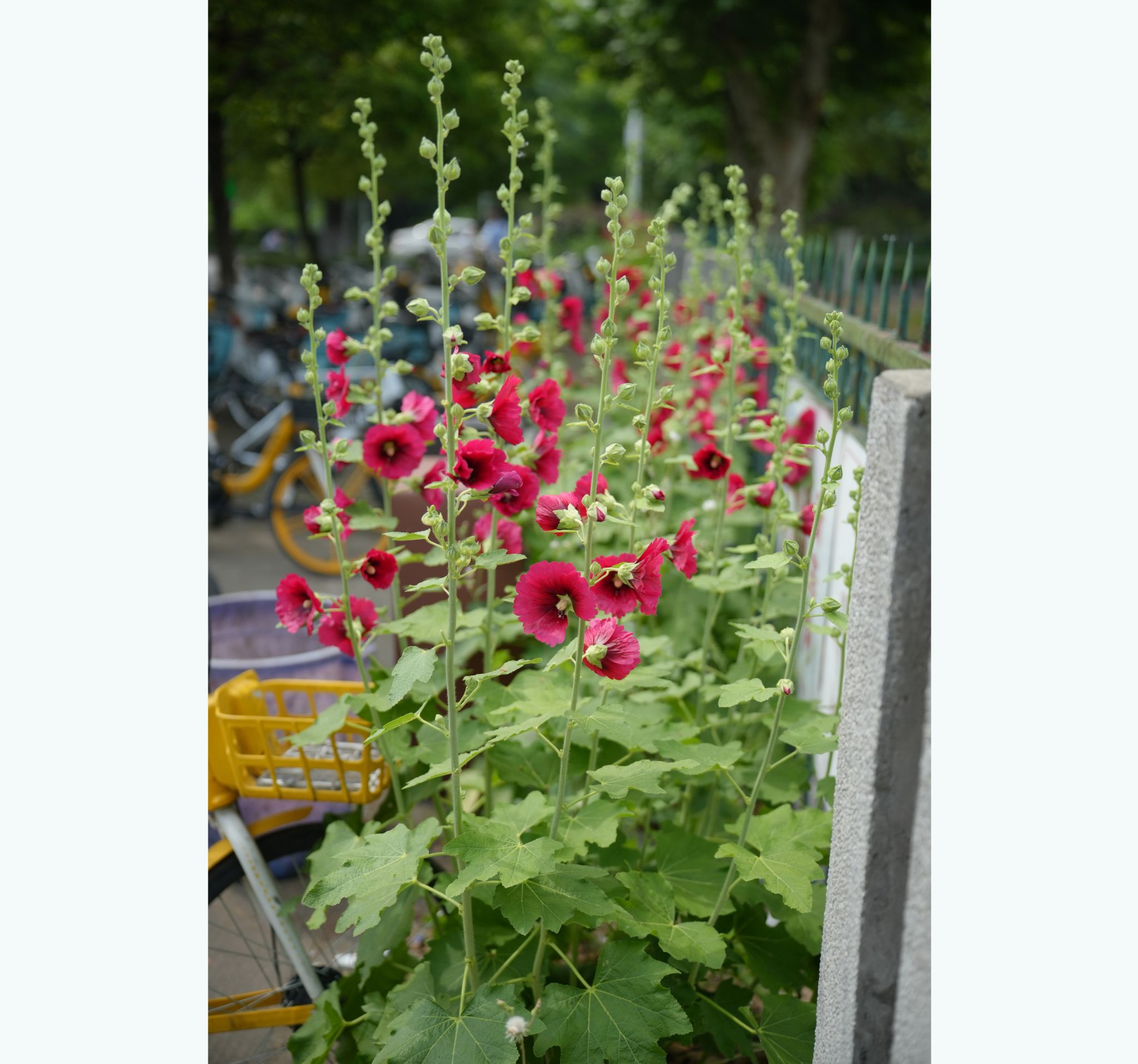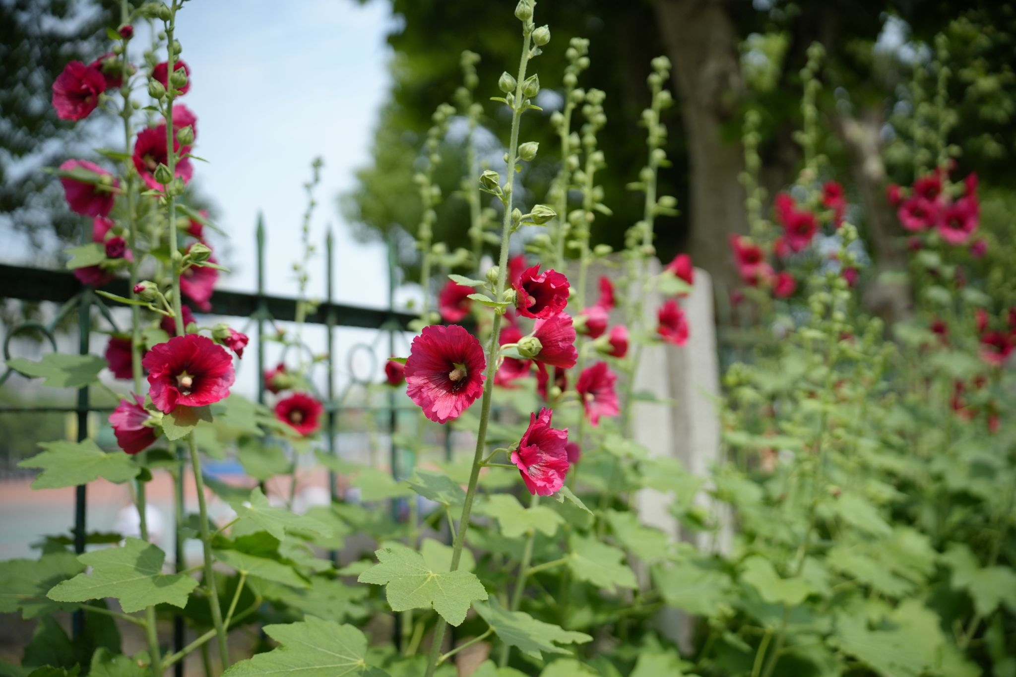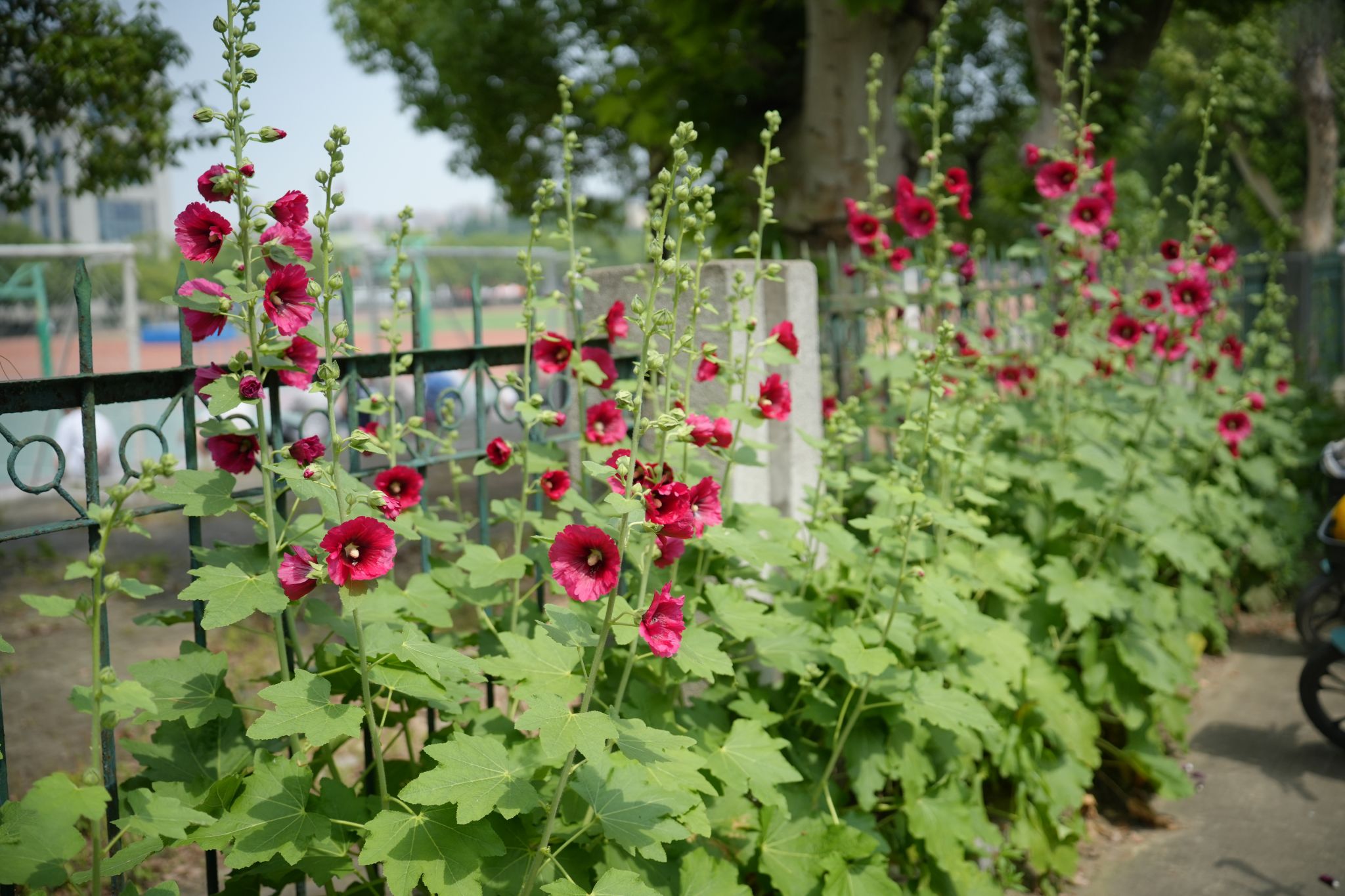 在校园运动场周边,一簇簇蜀葵花竞相怒放!蜀葵细瘦的茎上密匝匝开满火红的花球,花盘硕大,色彩艳丽,虽然它们朝开暮落,却丝毫不保留,热烈绽放自己!