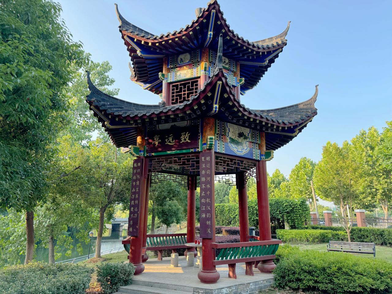 致远亭位于巡司河东岸,为两层六柱的亭式建筑,于2019年建成,南侧亭柱挂有“瞻巡司河水千秋汉韵鲸波鼍浪奔腾不止向江海 瞩学府书山万载楚才厚德博识鸿儒辈出传远方”的楹联,寓意新时代湖工大学子砥砺奋进、笃行致远。