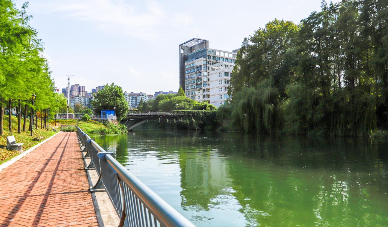 巡司河景观带位于学校东侧巡司河沿岸,北到学校东门厚德桥,南至东苑博学桥,主要由“三景两亭一台”组成,集中体现了校园文化中的修炼精神。“三景”指“修炼”“遇师”“放行”三处文化雕塑,“两亭”指巡司河西岸的“敬修亭”和东岸的“致远亭”,“一台”指巡司河东侧的亲水平台。