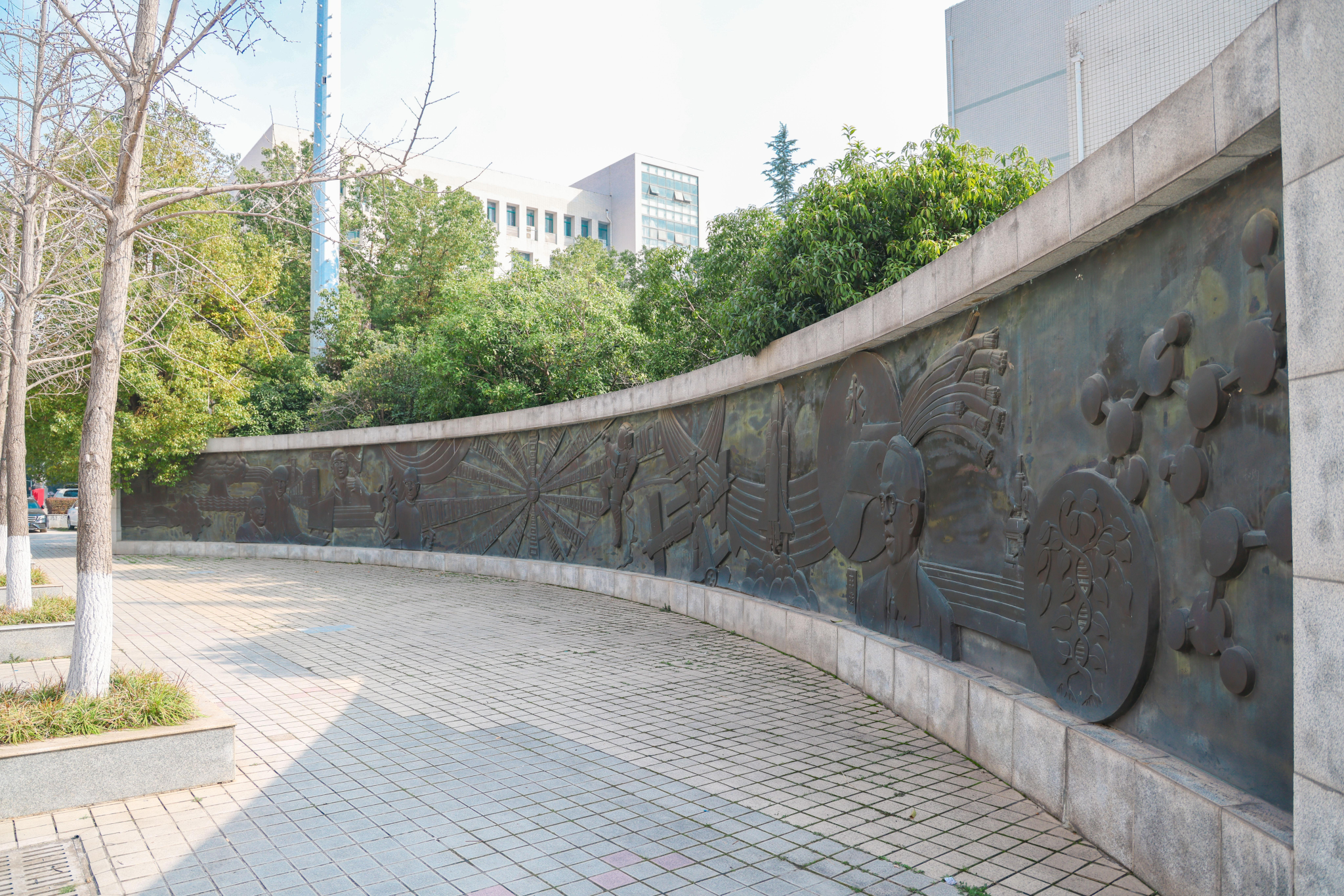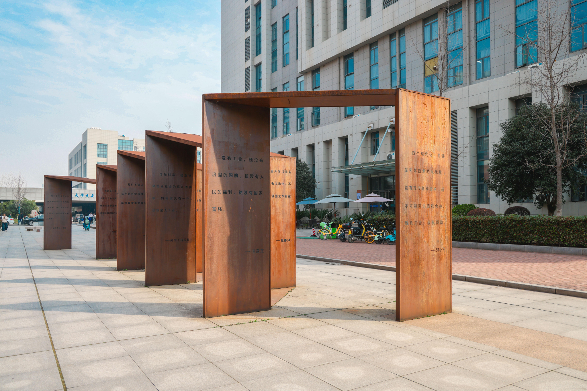 地面钢板折起组成蓬勃向上的抽象雕塑,与生物遗传的DNA抽象形态十分相似,整体也以螺旋上升形态组合。它矗立在校园里,高耸入云,象征着精神飞扬,寓意工业文化长廊有终点,工业发展无止境。激励莘莘学子勇担工业报国的使命,传承科学创新精神,为中国工业的腾飞贡献自己的力量。