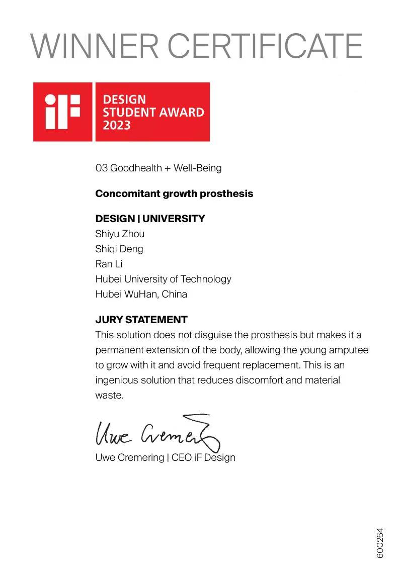 被誉为设计界奥斯卡的德国iF Design Student Award 2023于近日揭晓,由工业设计学院教师郑小茜指导、本科生周诗雨、邓诗琦以及李冉团队共同完成的概念设计作品Concomitant growth prosthesis在全球逾六千件参赛作品中脱颖而出,斩获iF学生设计奖。