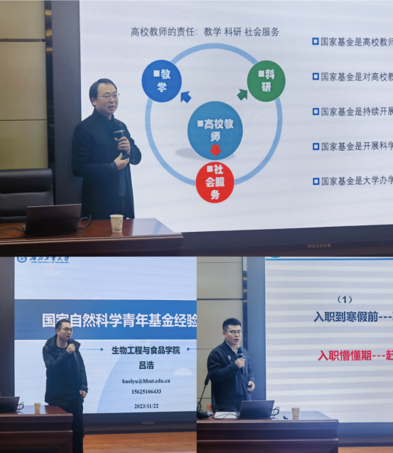 推进会还邀请了学校2023年获批国家自然科学基金的三位老师做经验分享。三位老师分别从不同角度分享了自己的基金心路历程,理学院王飞教授详细讲解了国家自然科学基金申报书撰写细节,以及获批基金后如何做好后续研究,为获批下一个基金做好充分准备。生物工程与食品学院吕浩老师、理学院孔德一老师用自己申请基金的心路历程鼓励在座的青年博士。