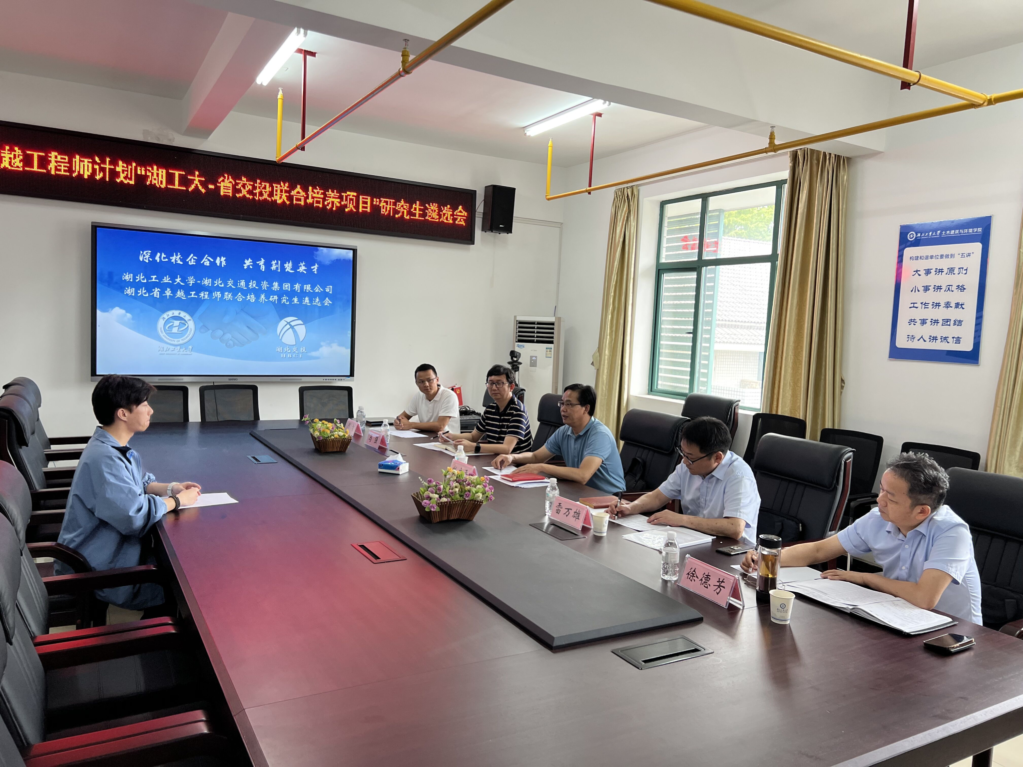 9月14日下午,湖北省卓越工程师计划(湖工大-省交投联合培养项目)研究生遴选会在土木建筑与环境学院410会议室举行。省交投建设集团技术中心主任雷万雄、长江路桥副总经理徐德芳、研究生院副院长钱应平、土木建筑与环境学院副院长马强、院长助理陈智作为遴选会工作专家出席了本次会议。