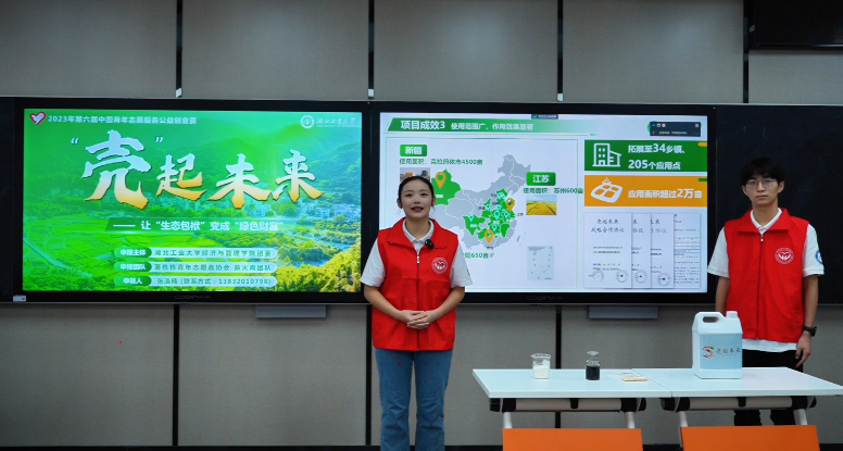 《“壳”起未来——让“生态包袱”变成“绿色财富”》志愿服务项目由经济与管理学院隋海清、张燕华、刘雪姣老师指导,依托萧栋栋青协成立“壳起未来”志愿服务队,汇聚23名相关专业学生,以党建引领,发挥专业优势,致力于虾壳固废资源化,让生态包袱变绿色财富。项目聚焦乡村振兴中可持续发展问题,组织志愿者围绕当前一系列法制法规和禁塑政策,以废弃虾蟹壳为原料,投身到技术研发和成果转化的志愿服务中,打开了生物可降解塑料在国内的终端应用市场。志愿者积极对接政府争取政策,与企业合作提供全周期技术服务,在推广农用地膜的过程中为农户开展志愿宣讲、产品推广等服务,此基础上形成2G2C2B的公益创业模式,在实现自我造血的同时助力农民增收致富,改善乡村生态环境,为推动建设美丽乡村进程贡献了湖工力量。三年来,团队走过34个乡镇,打造205个应用点及科技小院,受新华社等多家主流媒体报道,目前已收到来自新疆、河北等地的合作邀请。