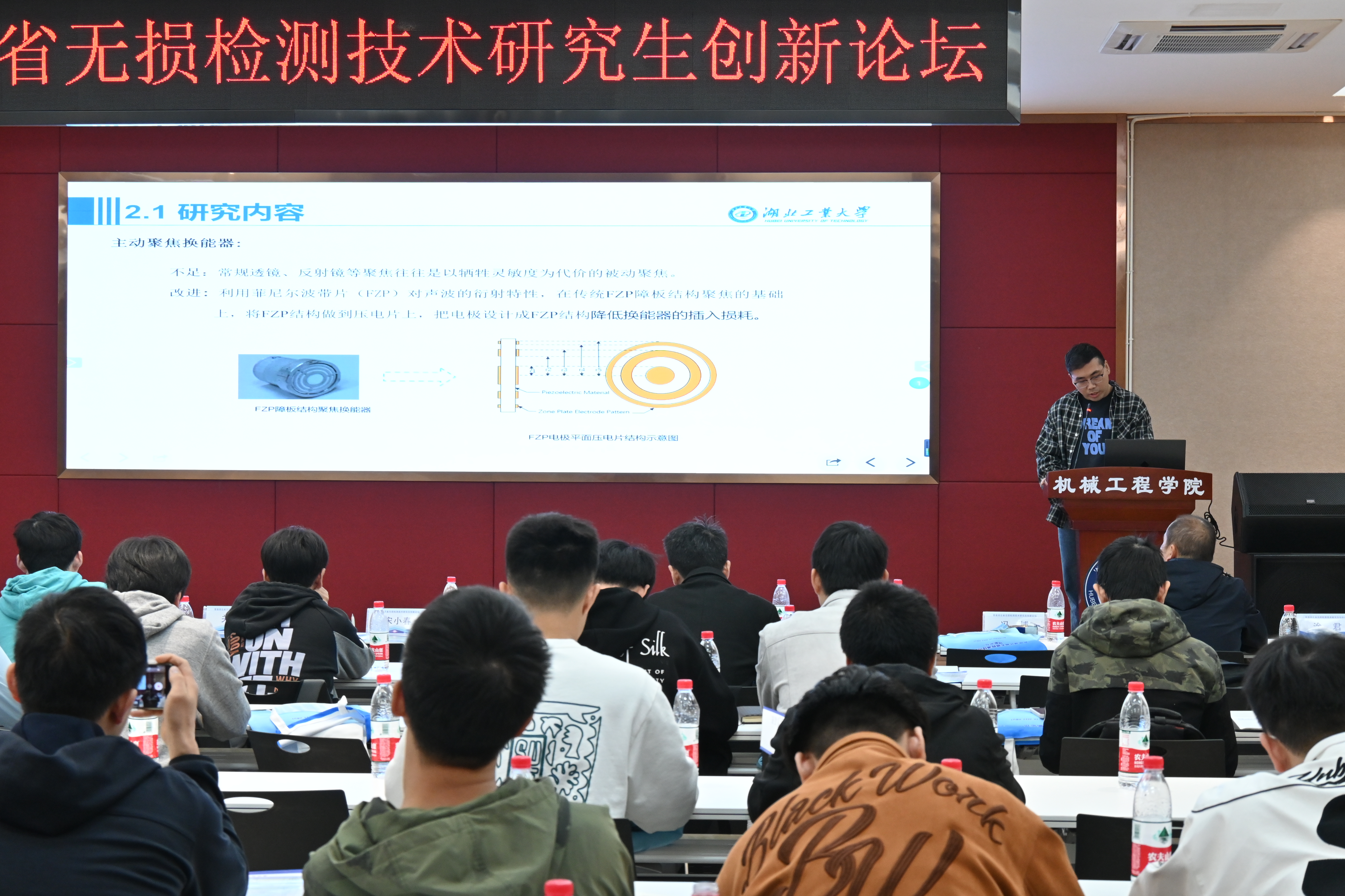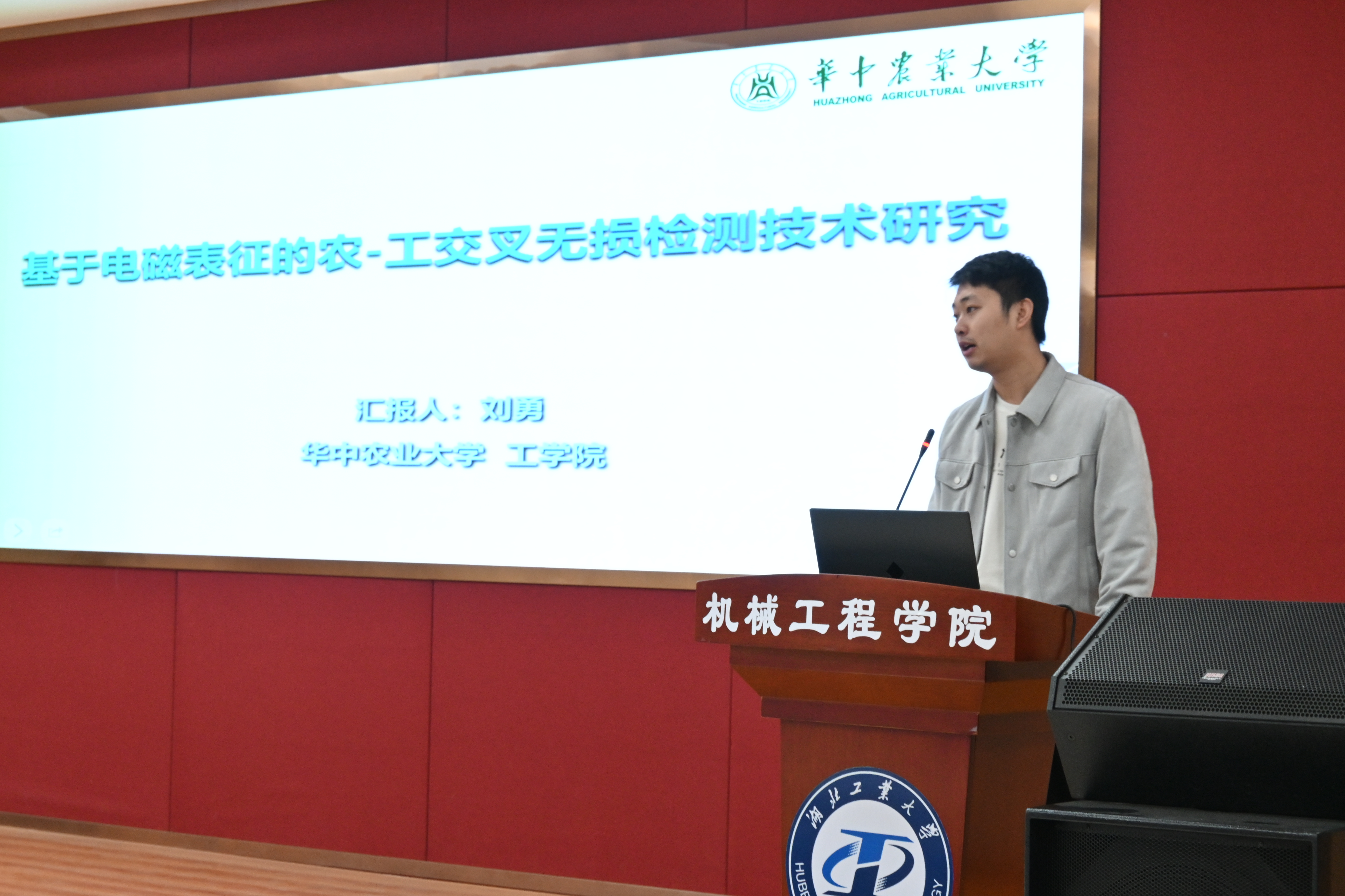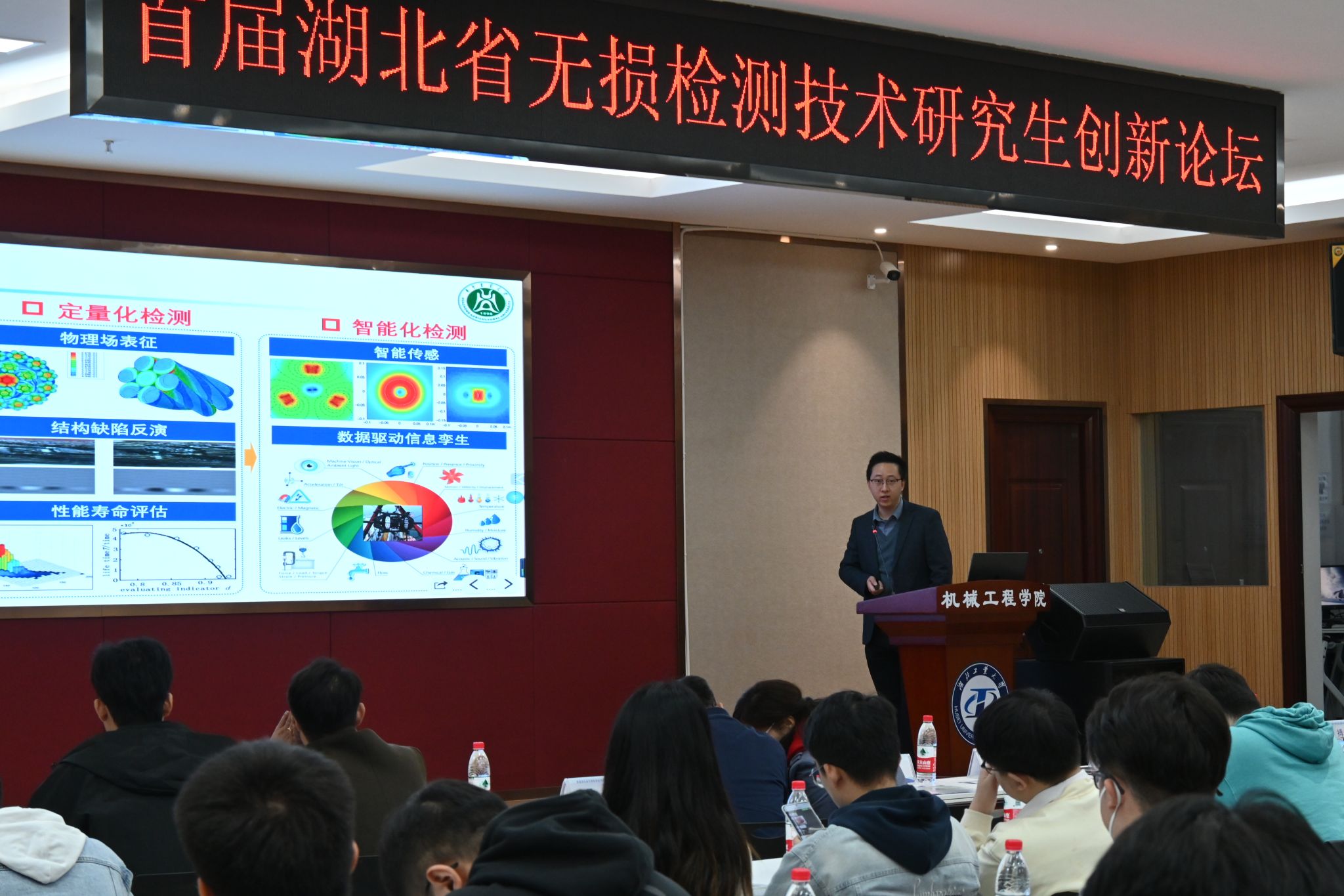 论坛主旨报告环节由机械工程学院副院长、湖北·武汉无损检测学会秘书长聂磊教授主持,华中科技大学机械科学与工程学院马波教授、华中农业大学工学院刘世伟副教授分别作“MEMS超声换能器研究进展及其应用”、“电磁无损检测/评估研究及其应用进展”两项主旨报告。随后,来自华中科技大学、华中农业大学、武汉理工大学、湖北工业大学的7名研究生代表分别从磁粉三维立体显影与定量化识别、刀片式脉冲涡流探头、光纤非侵入监测、电磁表征农工交叉无损检测、生菜理化指标高光谱无损检测、单向点聚焦表面波电磁超声检测、宽带匹配主动聚焦超声换能器等最新研究进展分享了学术成果。
