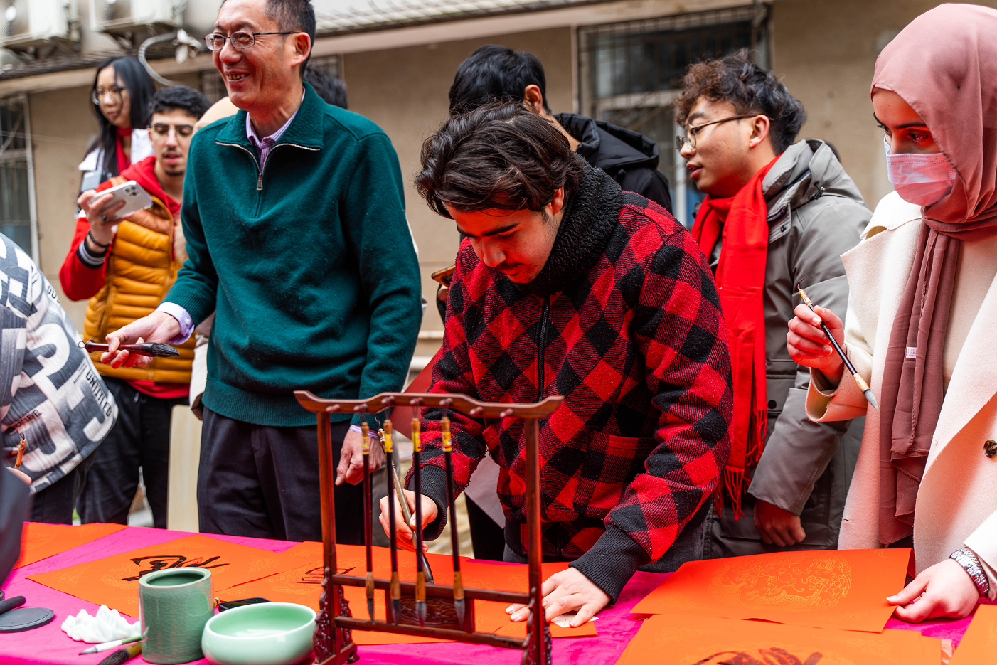 书法文化展位前,国际学生在老师的指导下,“毛笔起舞书春意,留下心愿共传承。字艺交流情意浓,繁体楷书皆有神。”
