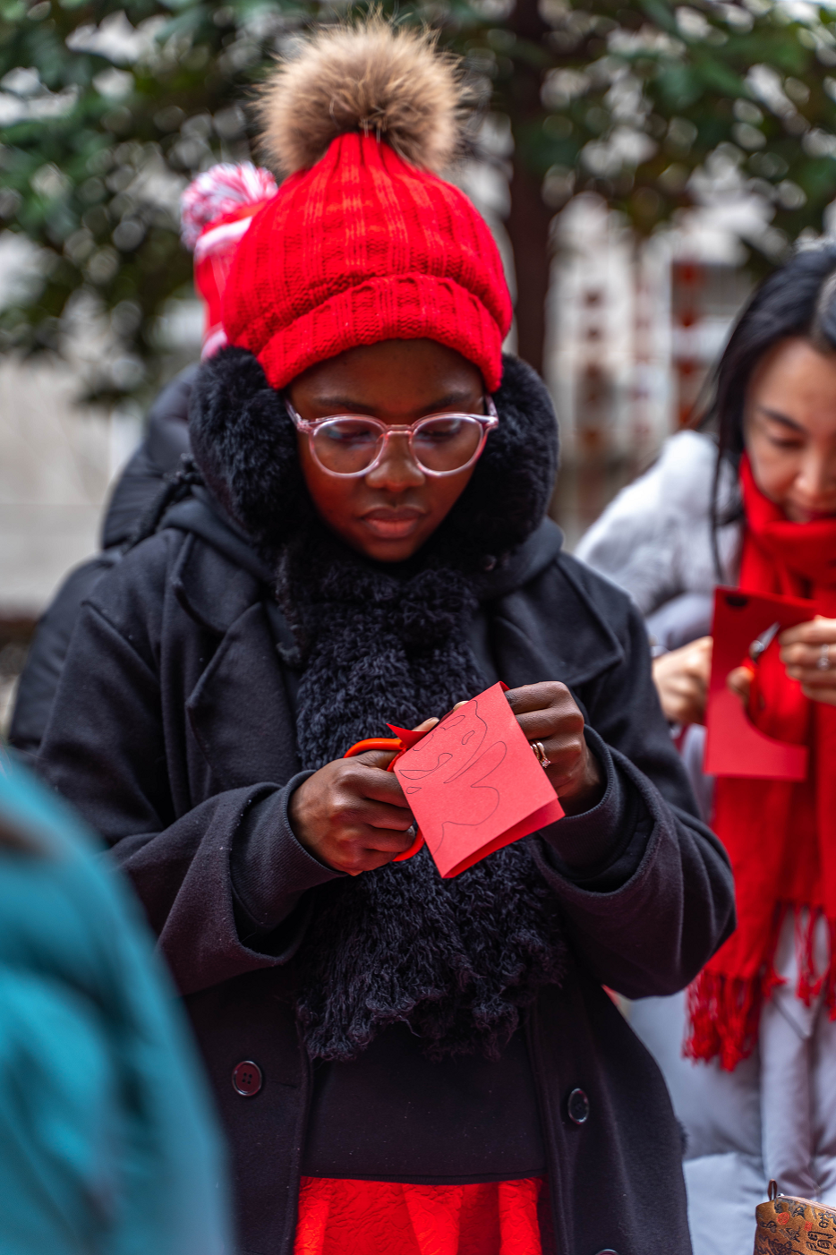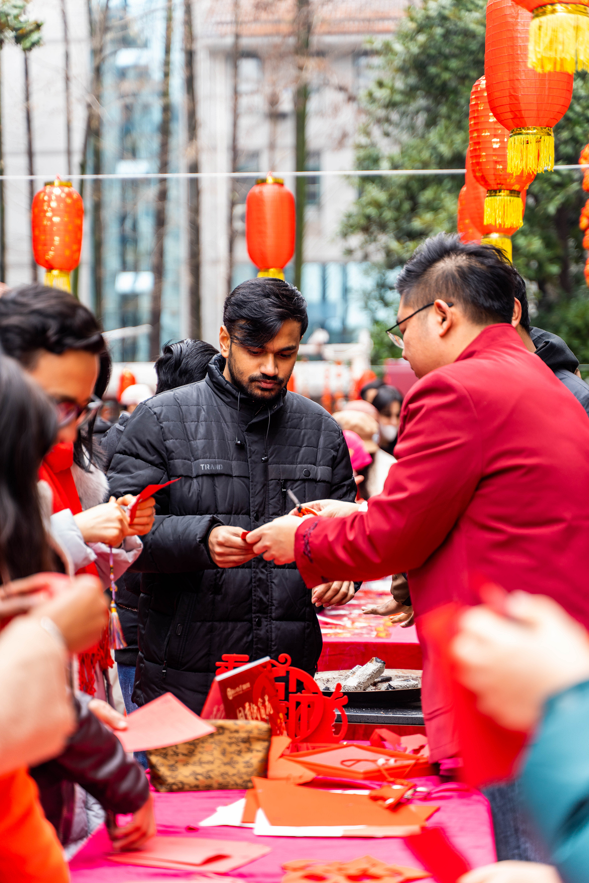剪纸文化展位前,国际学生“纸片飞舞剪成画,窗前飘舞乐陶然。国际学子同剪纸,传统工艺翩翩舞。”