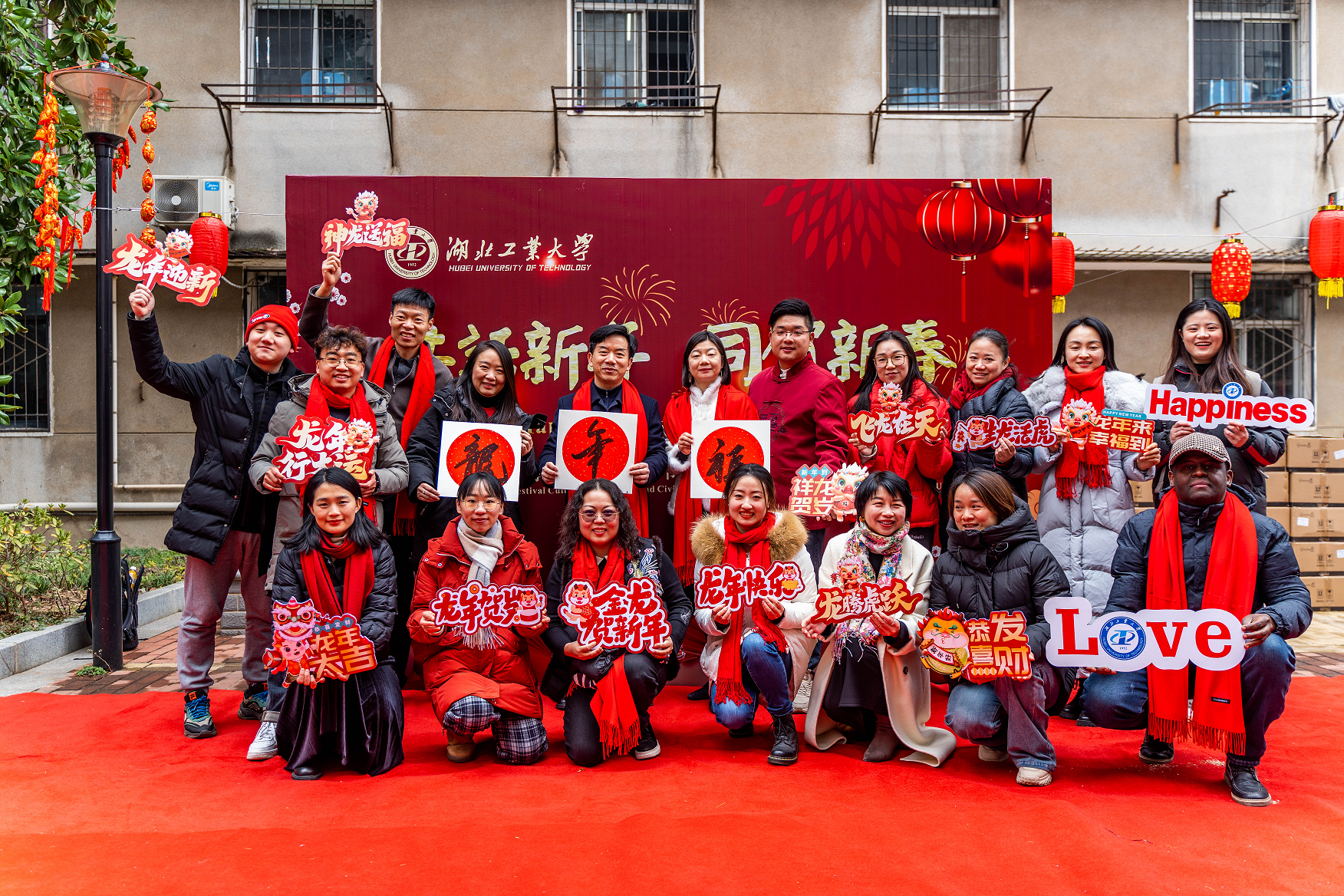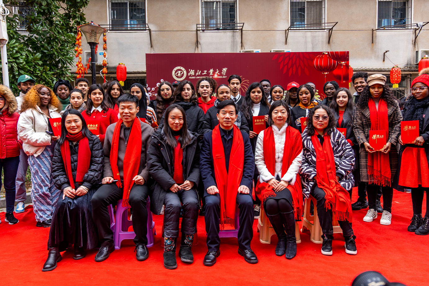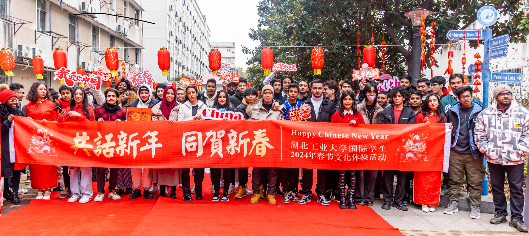 为让国际学生体验中国传统新年的氛围、感受中华传统文化的魅力,1月20日下午,国际学院在国际学生中心开展2024年湖北工业大学国际学生“共话新年,同贺新春”龙年文化体验暨文明宿舍评比颁奖慰问活动。校党委常委、副校长宋小春亲临现场,汉口学院副校长刘易国,湖北工业大学外国语学院副教授陈慧老师,国际学院全体领导们与教职工们也都来到节日现场。