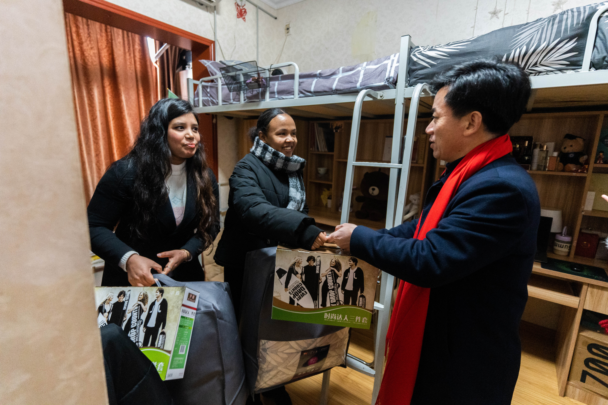 随后,宋校长走访学生宿舍,为国际学生送来新春慰问,叮嘱他们注意保暖,好好学习,讲好中国故事,传播中国文化。